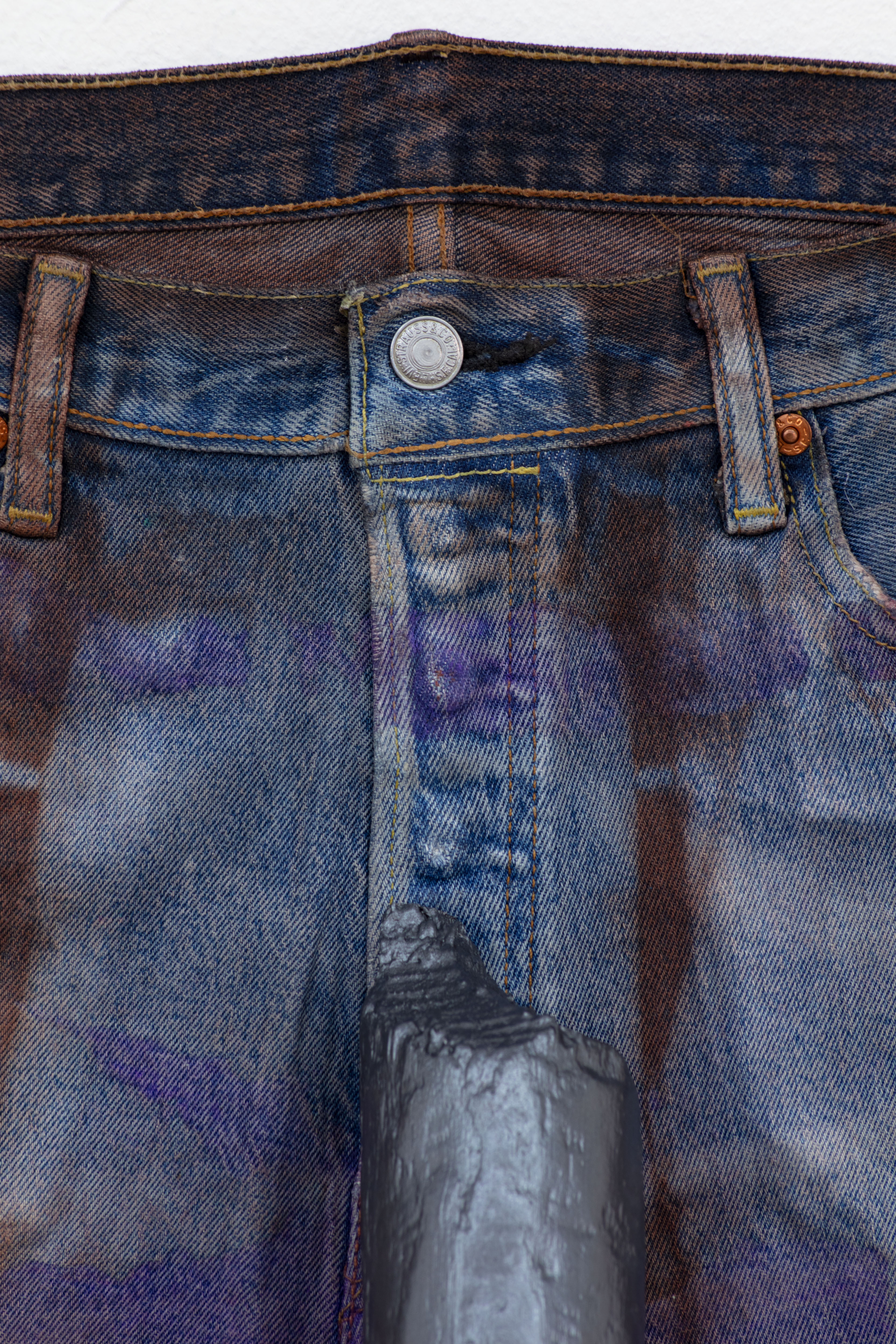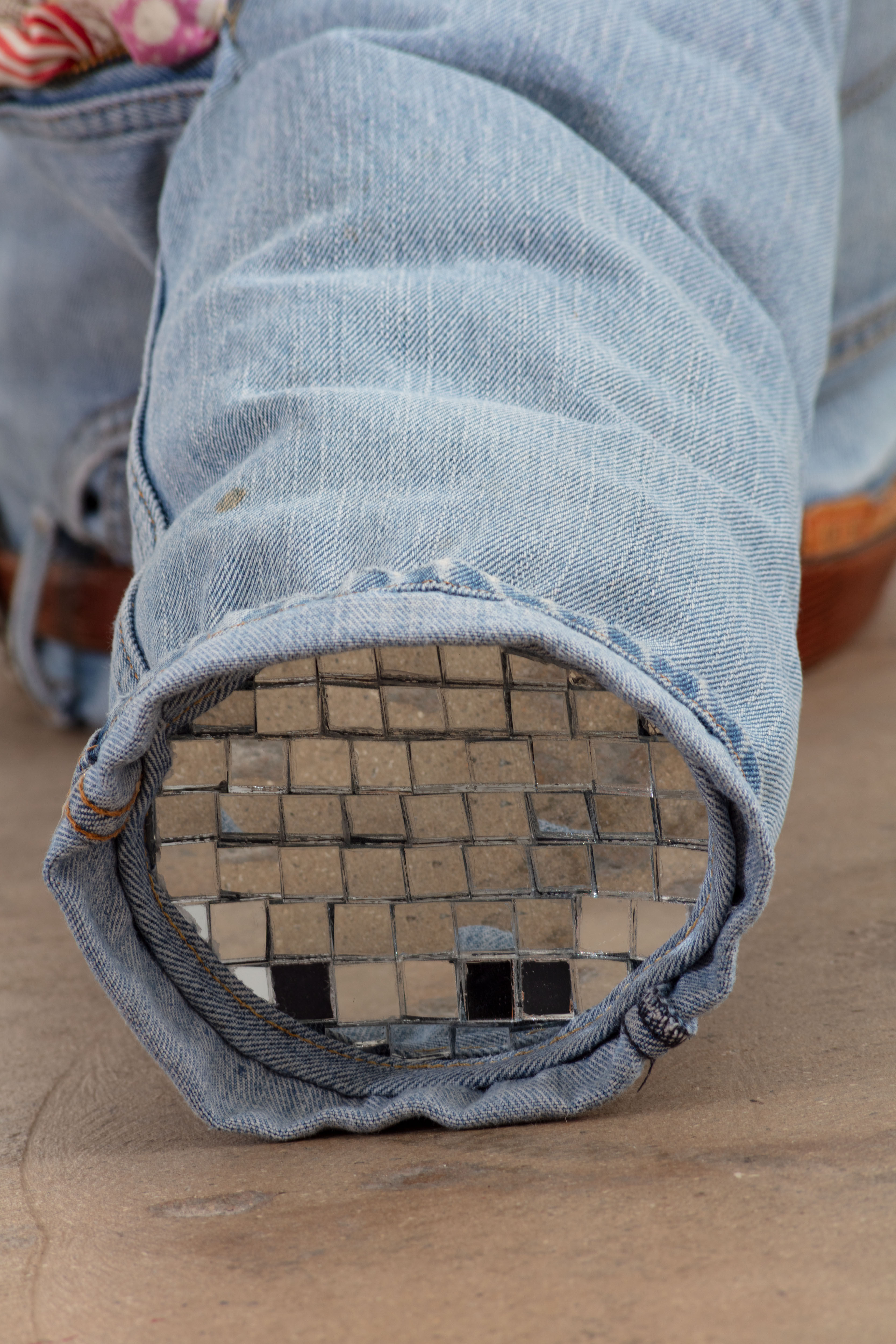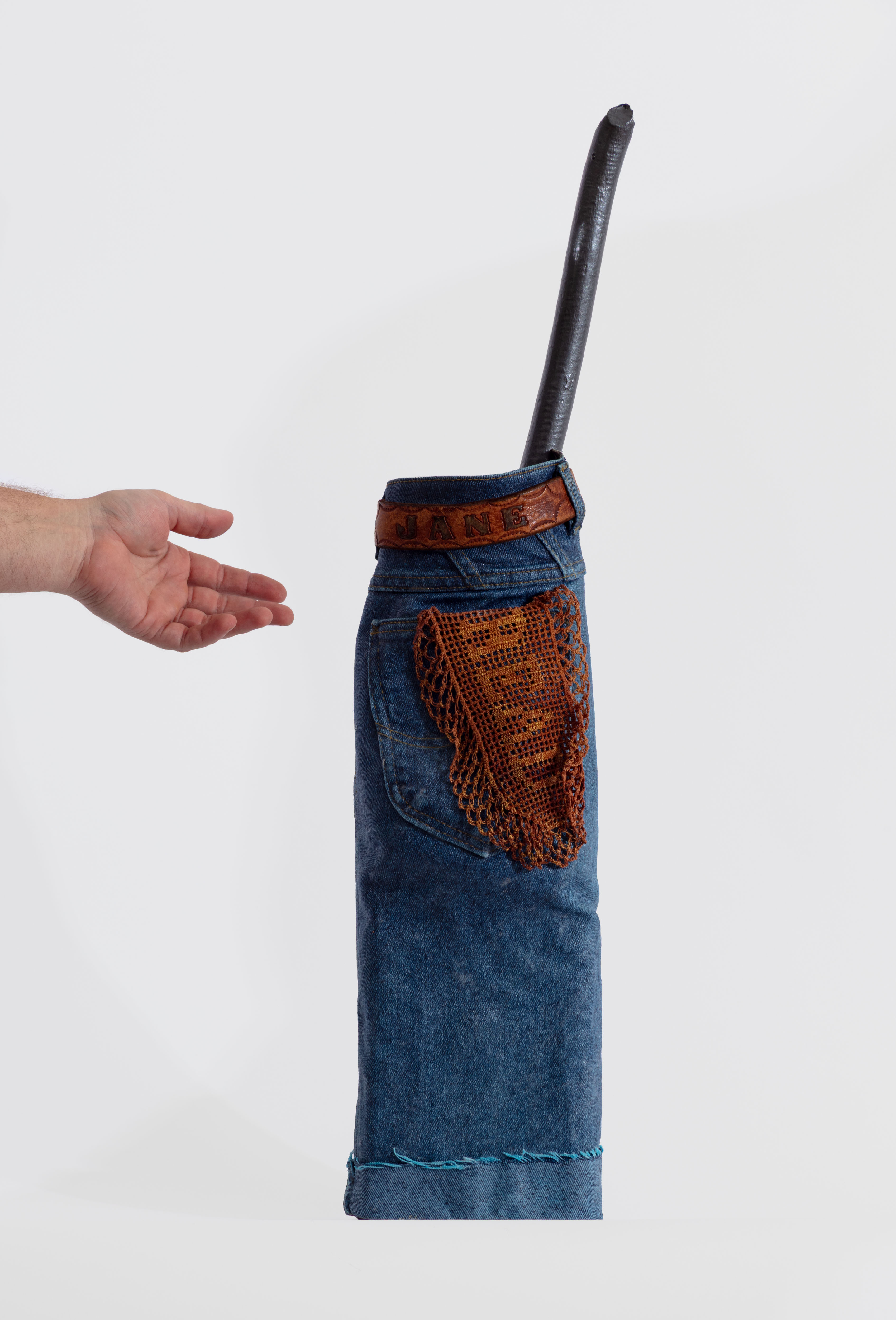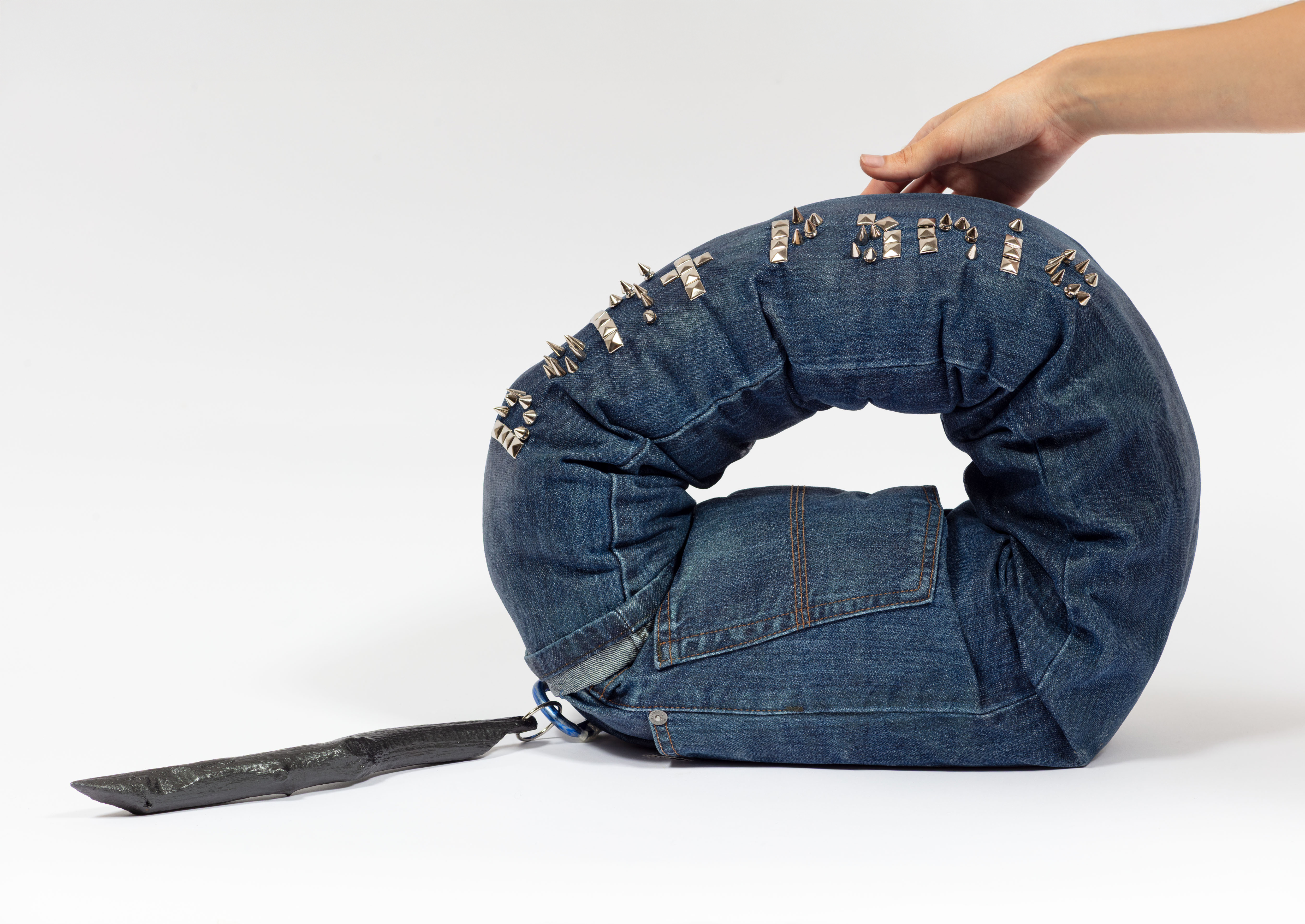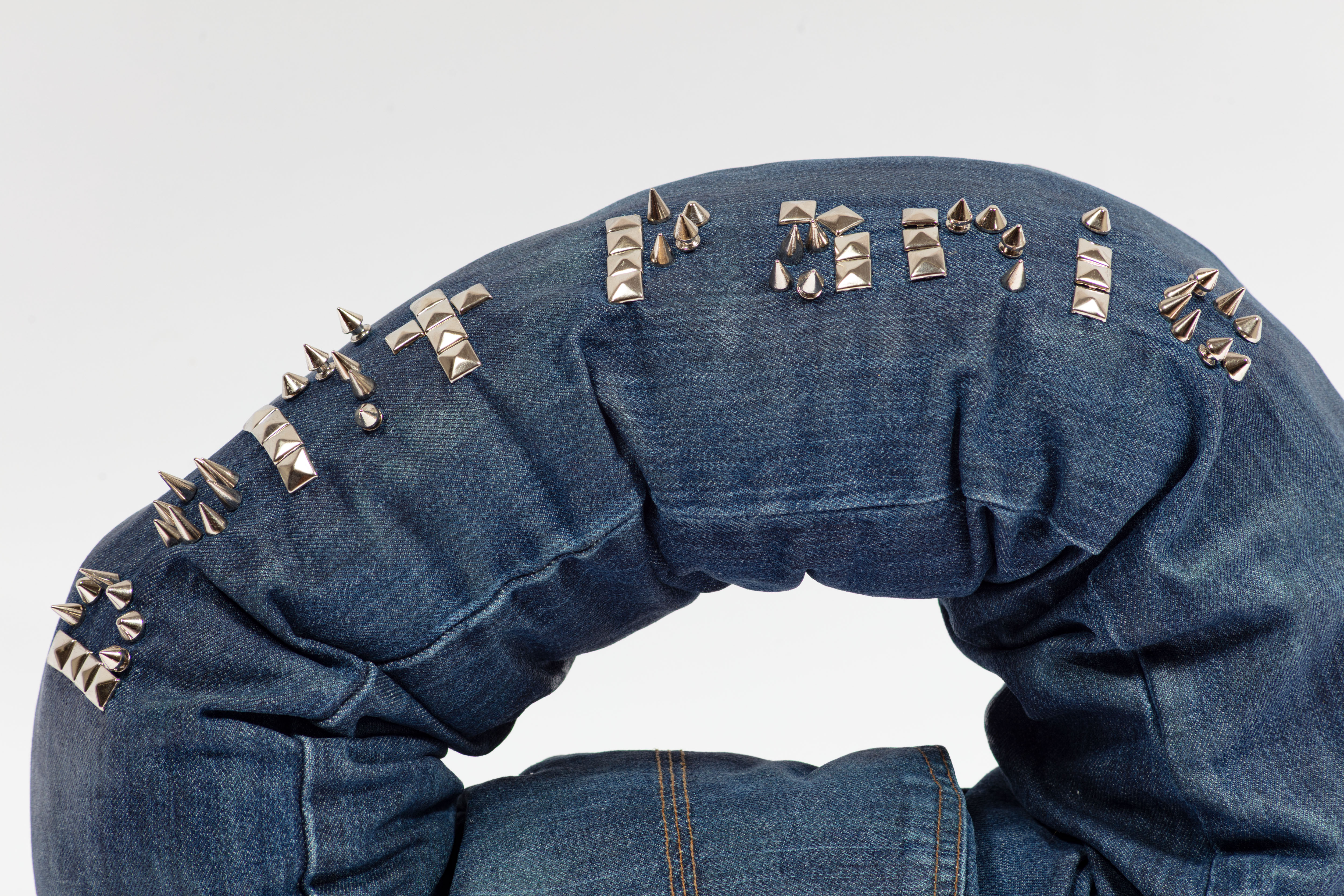Don’t Panic takes the form of a single jeans leg looped so the cuffed ankle slips neatly into the waist, forming a closed, self-consuming circuit. Radial wrinkles gather around the back pocket, but the denim remains taut across the outer curve to clearly spell “Don’t Panic” in punk studs, a nod to the “Dyke Tactics” studded leather jacket from the Lesbian Herstory Archives.