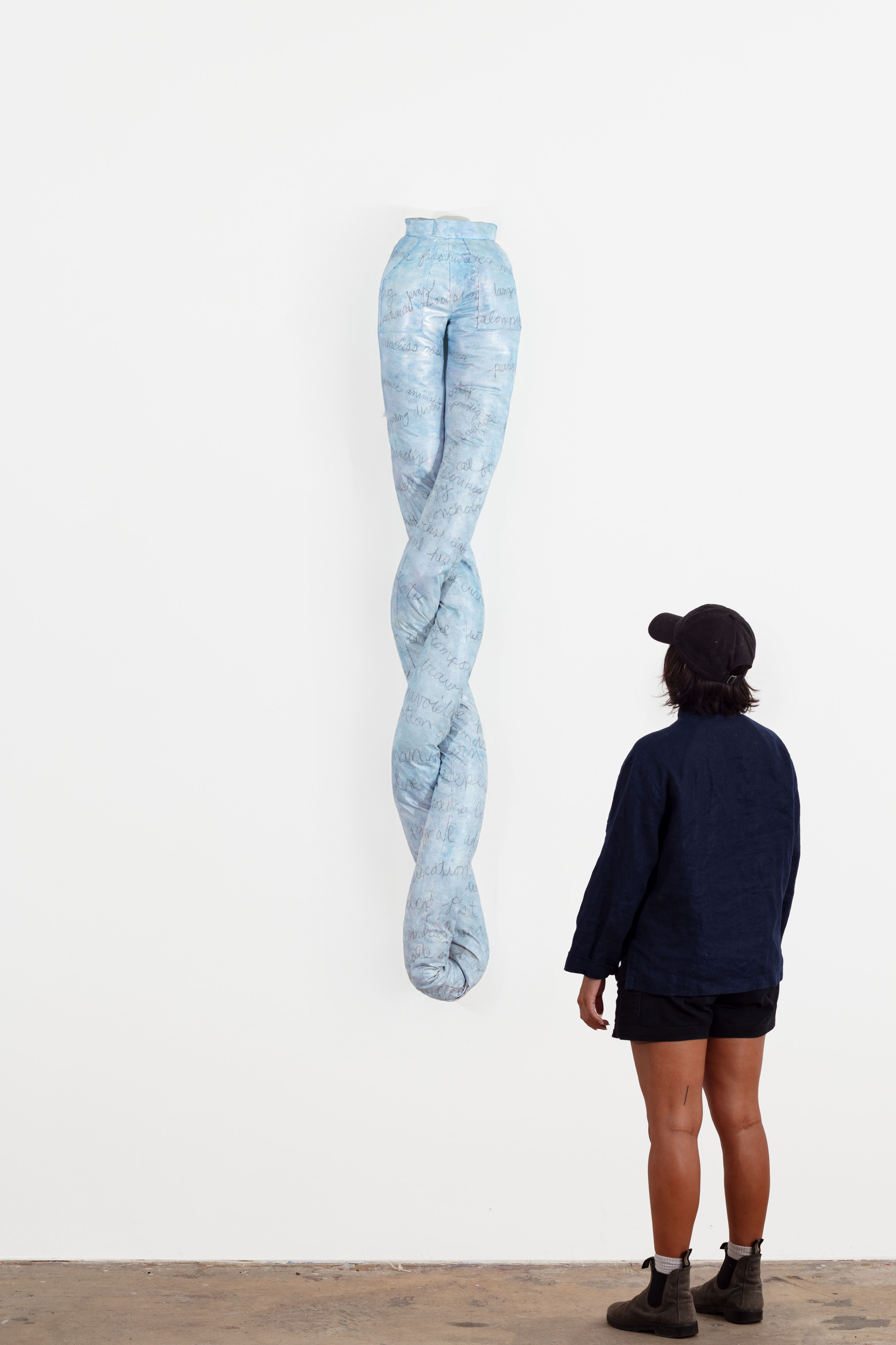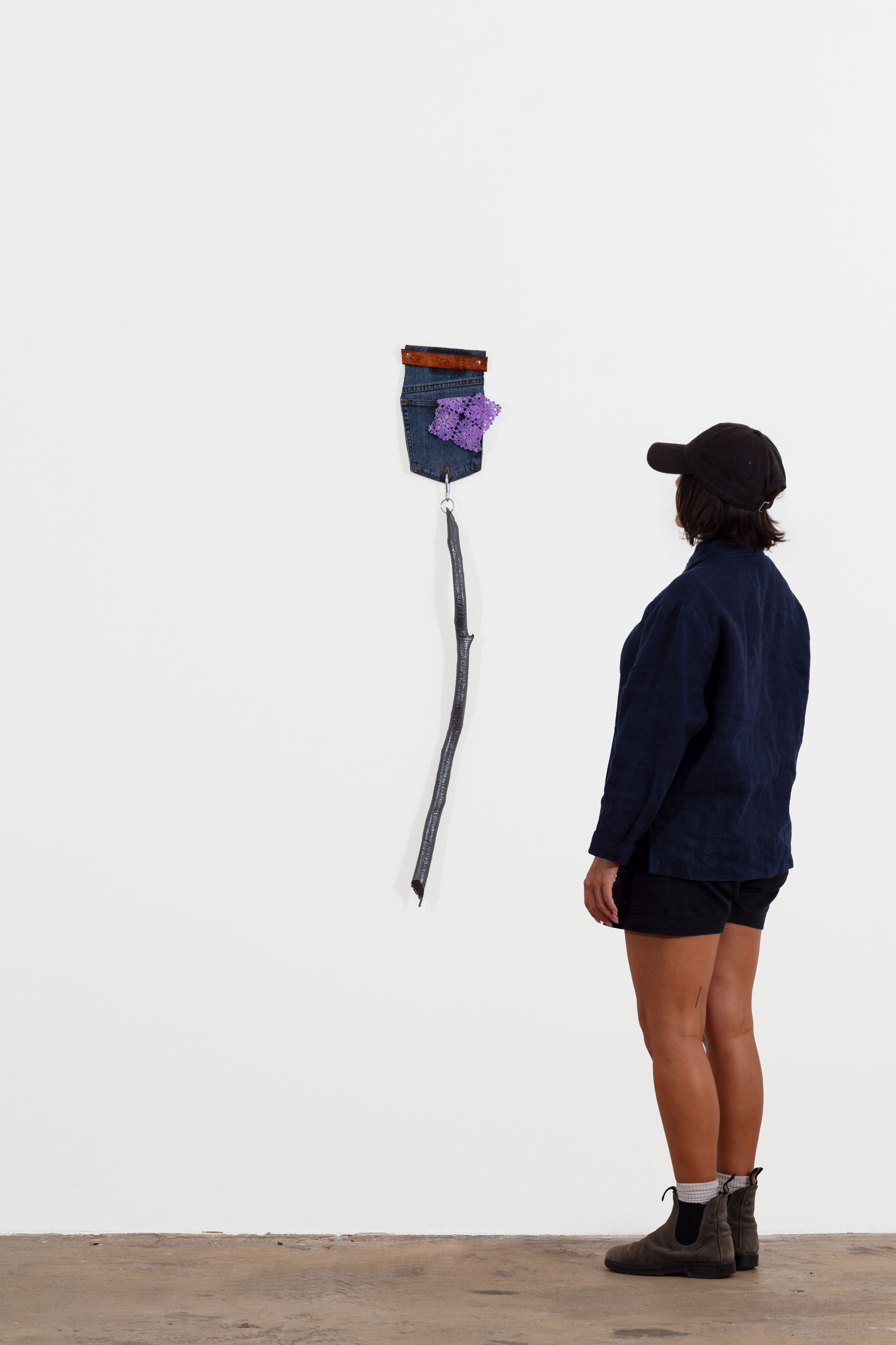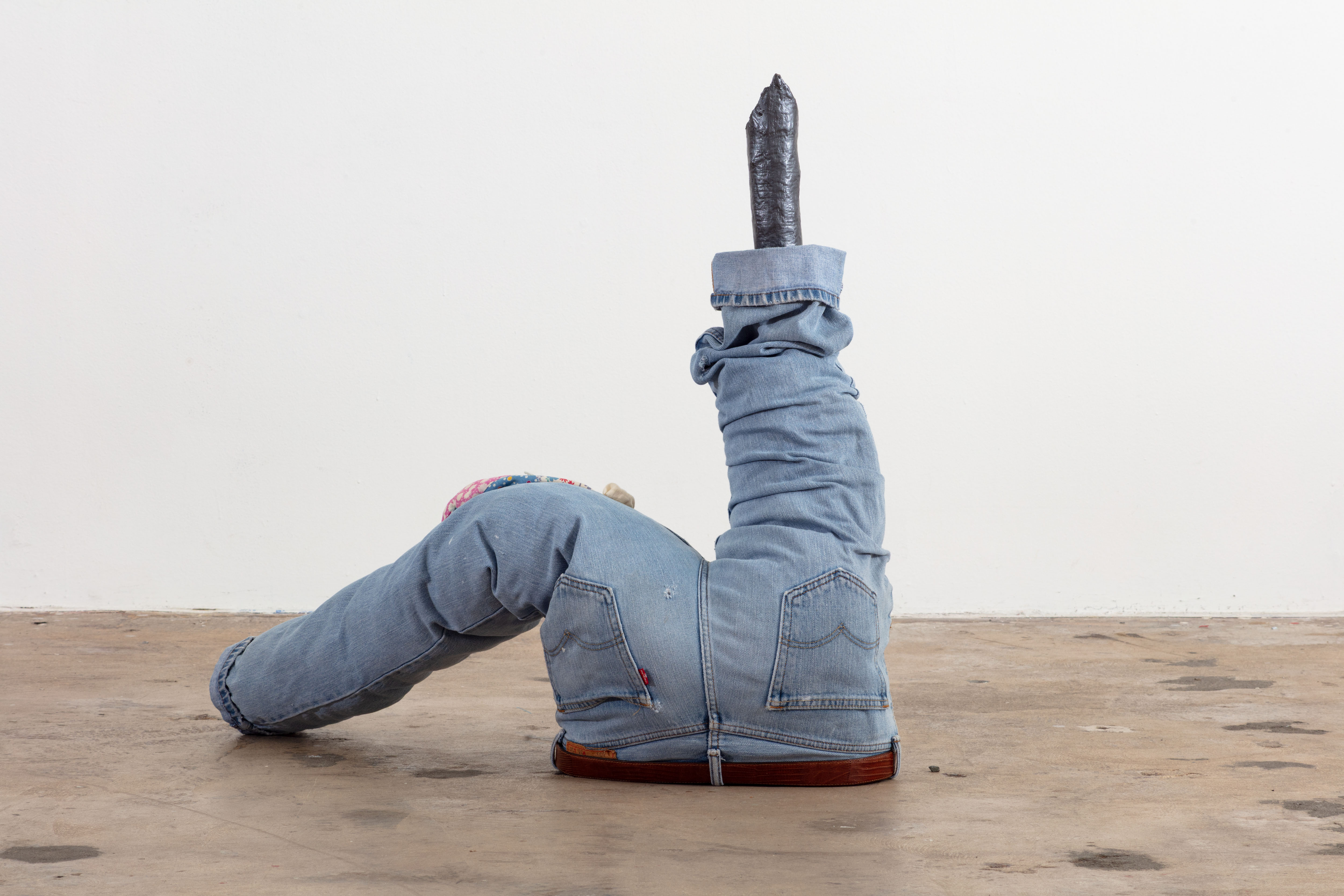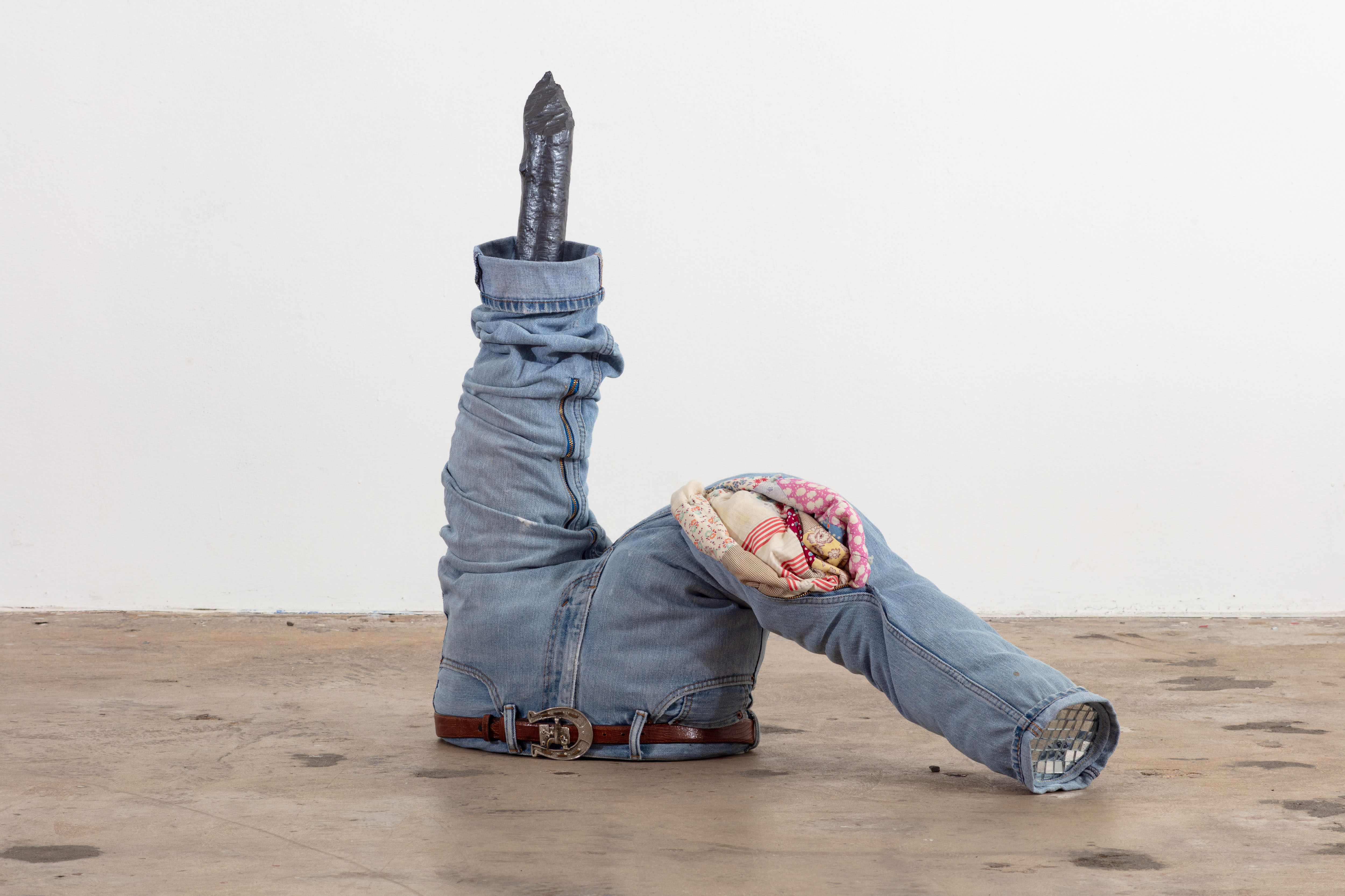 Don’t Panic takes the form of a single jeans leg looped so the cuffed ankle slips neatly into the waist, forming a closed, self-consuming circuit. Radial wrinkles gather around the back pocket, but the denim remains taut across the outer curve to clearly spell “Don’t Panic” in punk studs, a nod to the “Dyke Tactics” studded leather jacket from the Lesbian Herstory Archives.