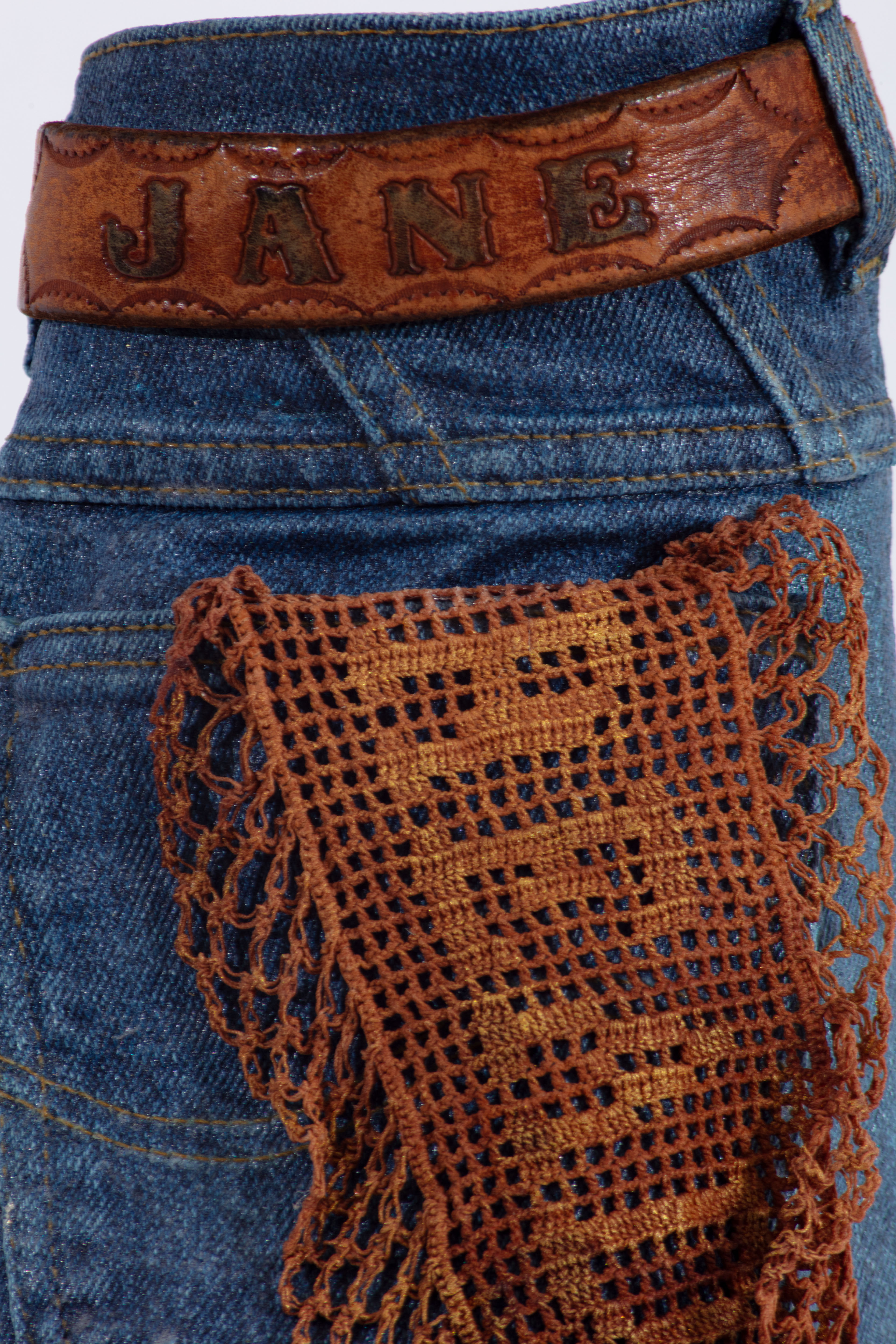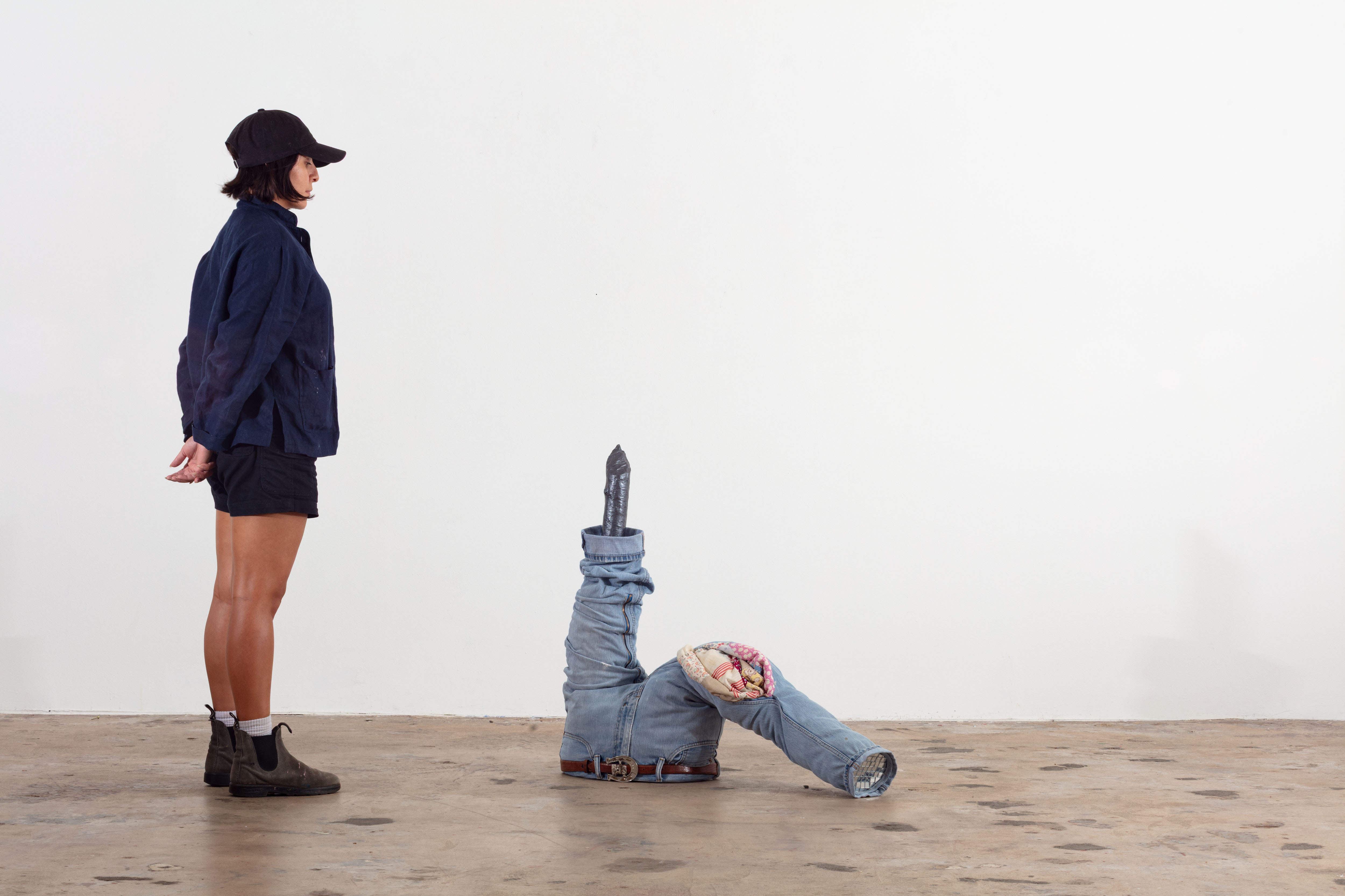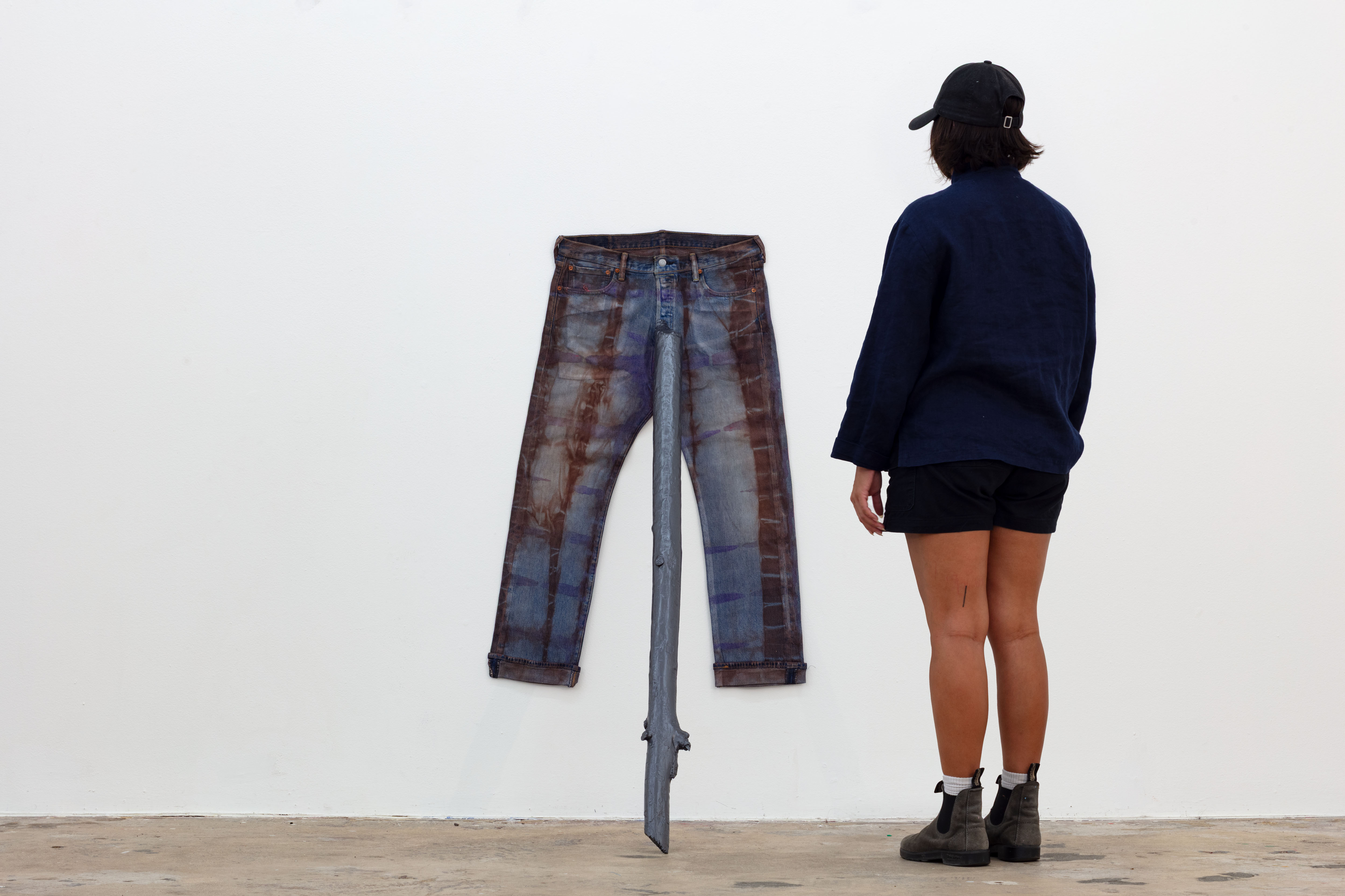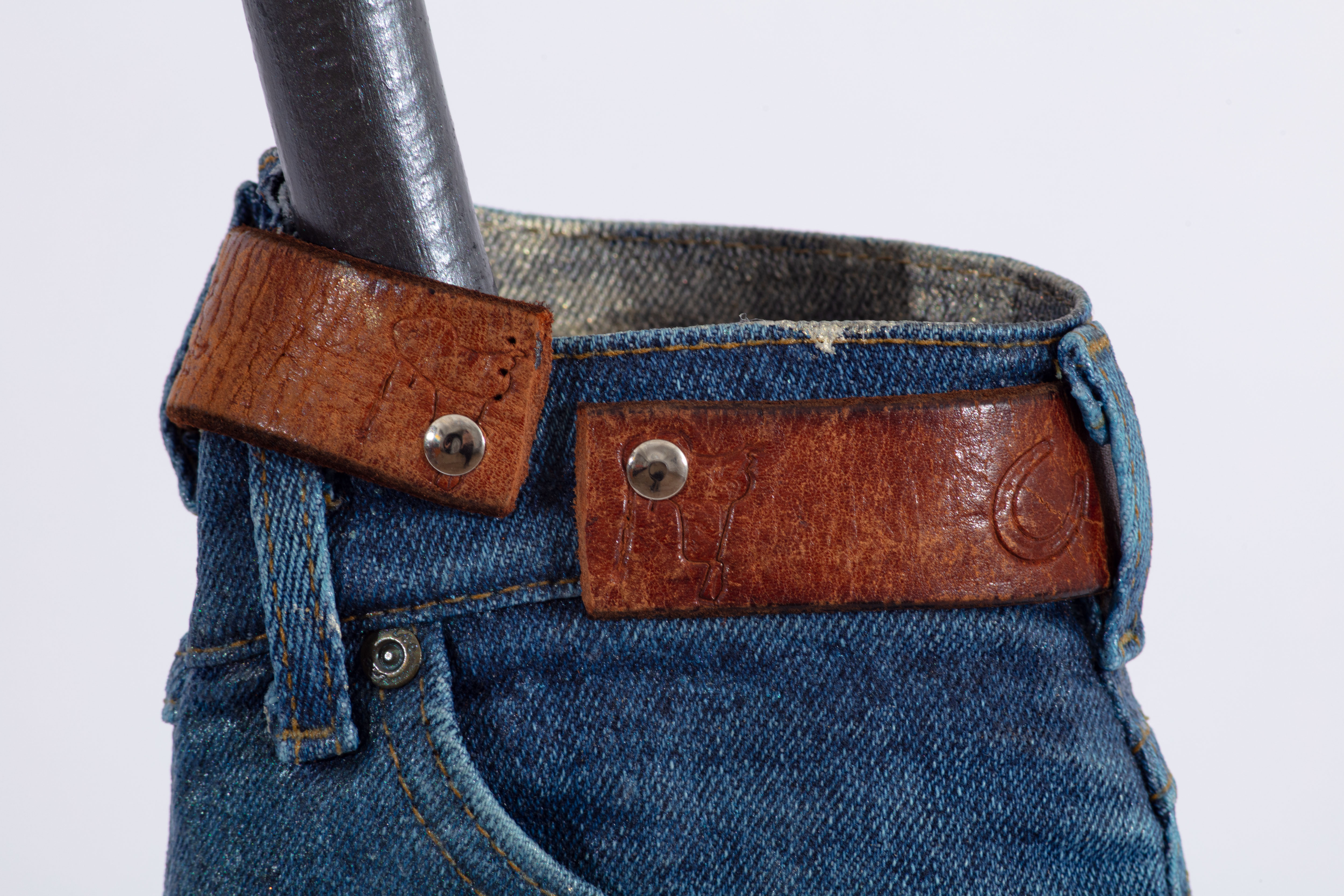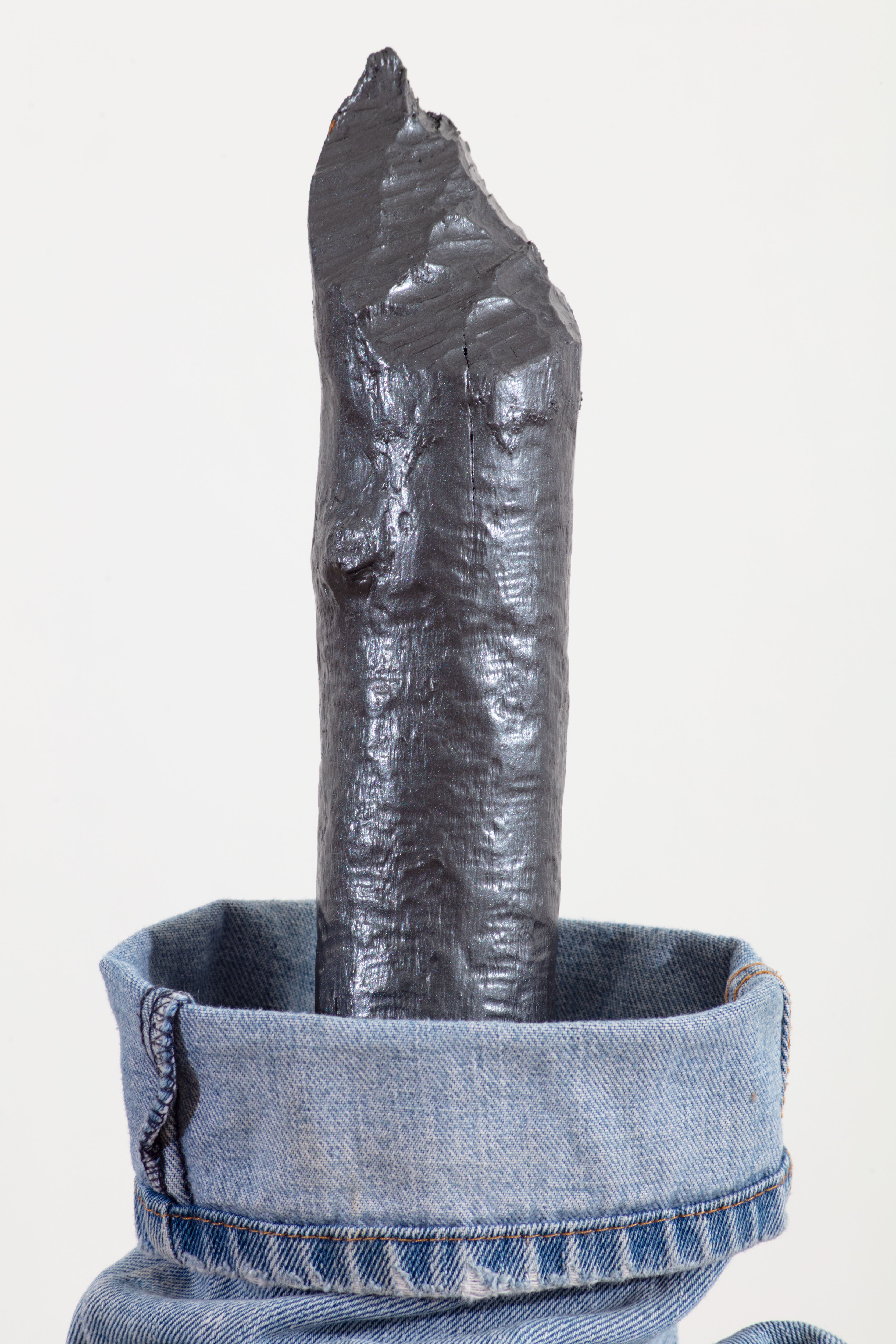 Don’t Panic takes the form of a single jeans leg looped so the cuffed ankle slips neatly into the waist, forming a closed, self-consuming circuit. Radial wrinkles gather around the back pocket, but the denim remains taut across the outer curve to clearly spell “Don’t Panic” in punk studs, a nod to the “Dyke Tactics” studded leather jacket from the Lesbian Herstory Archives.