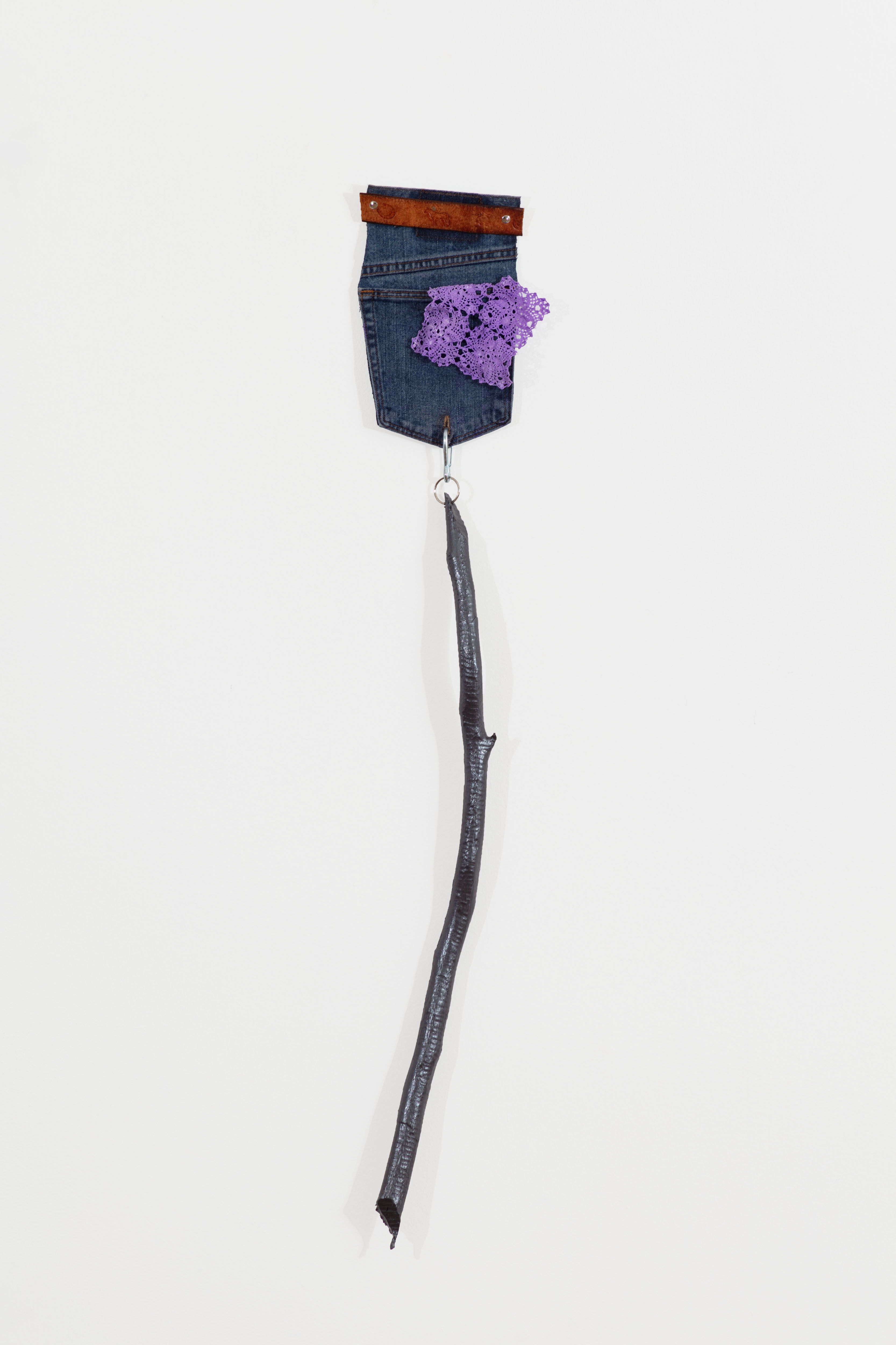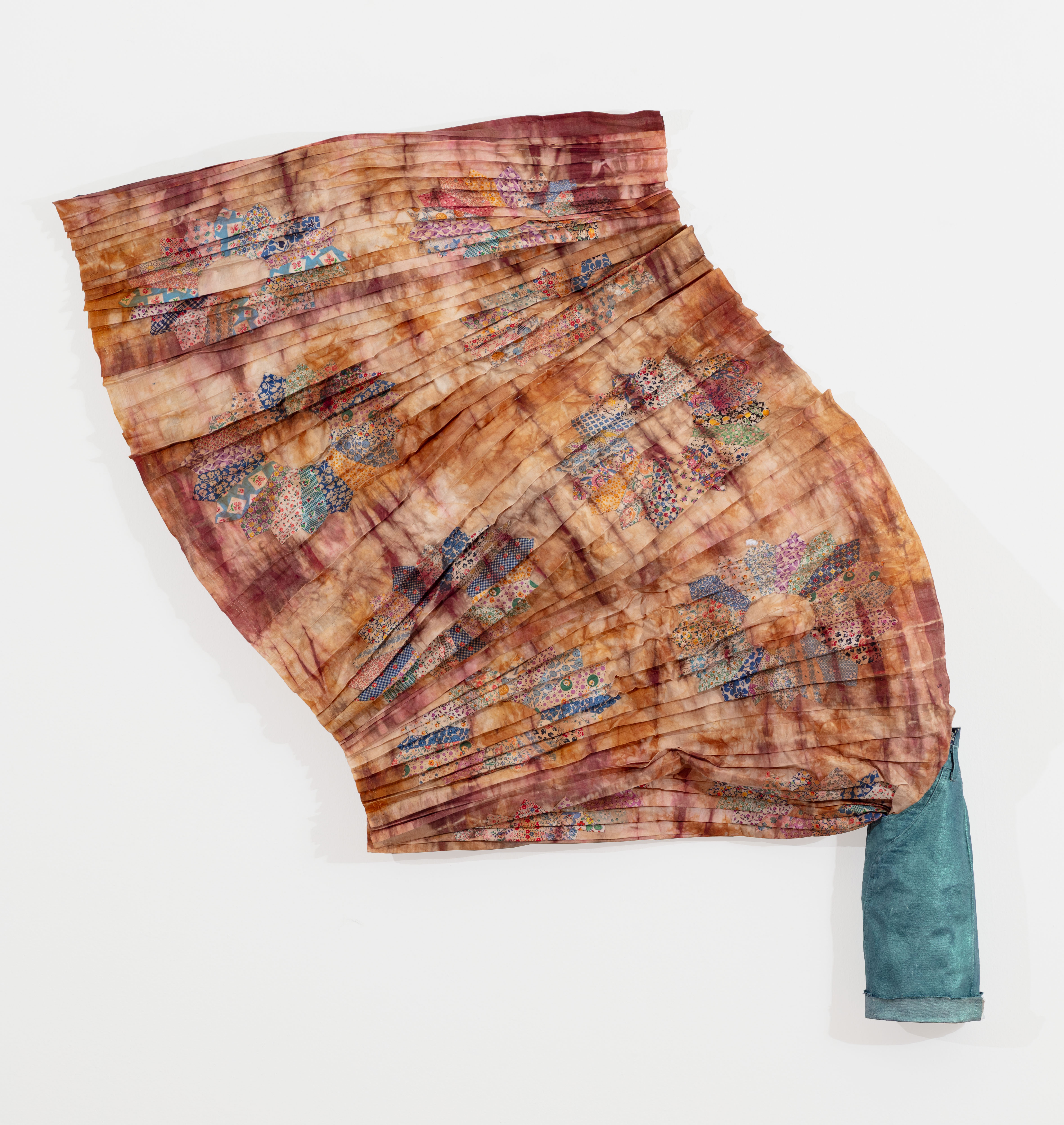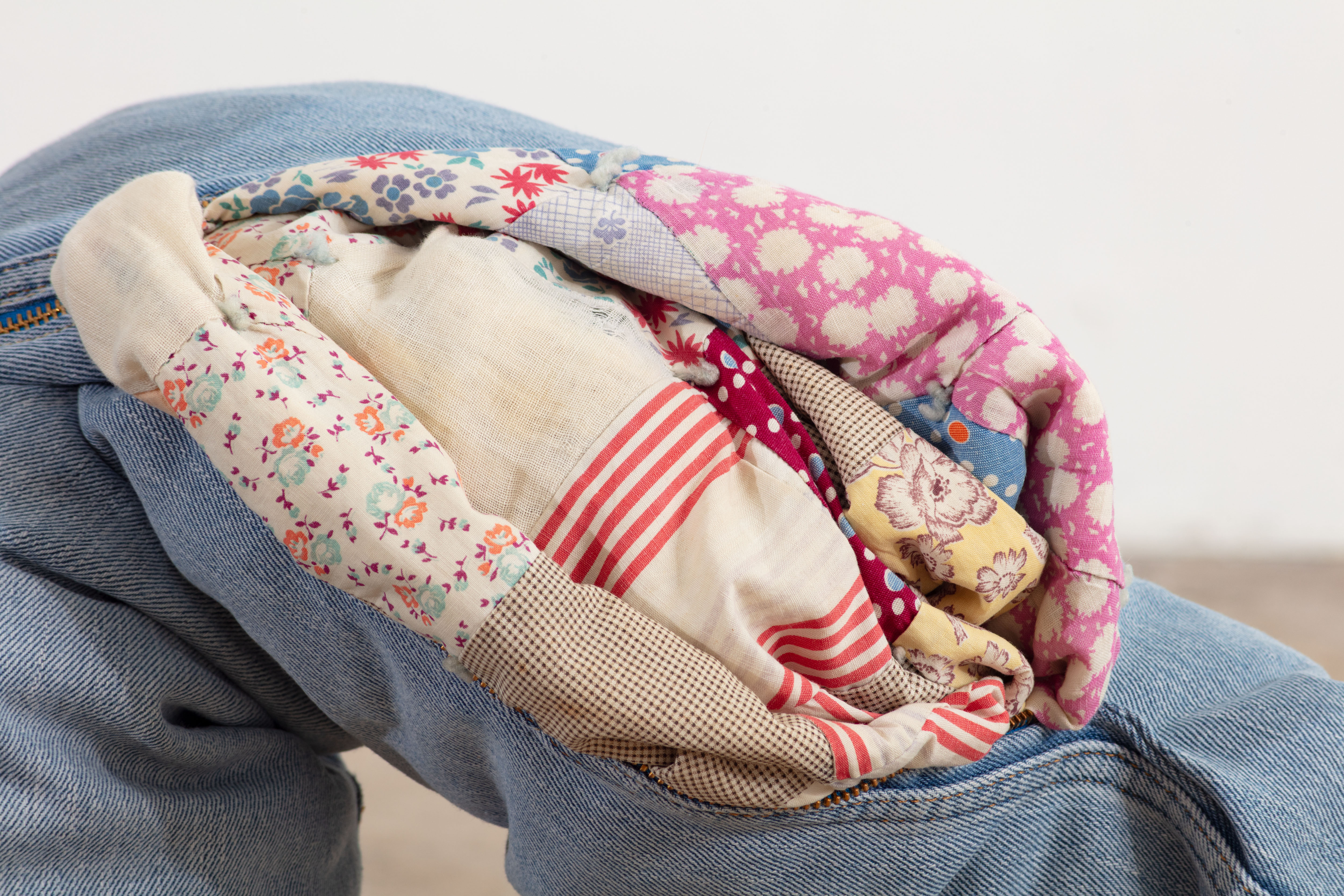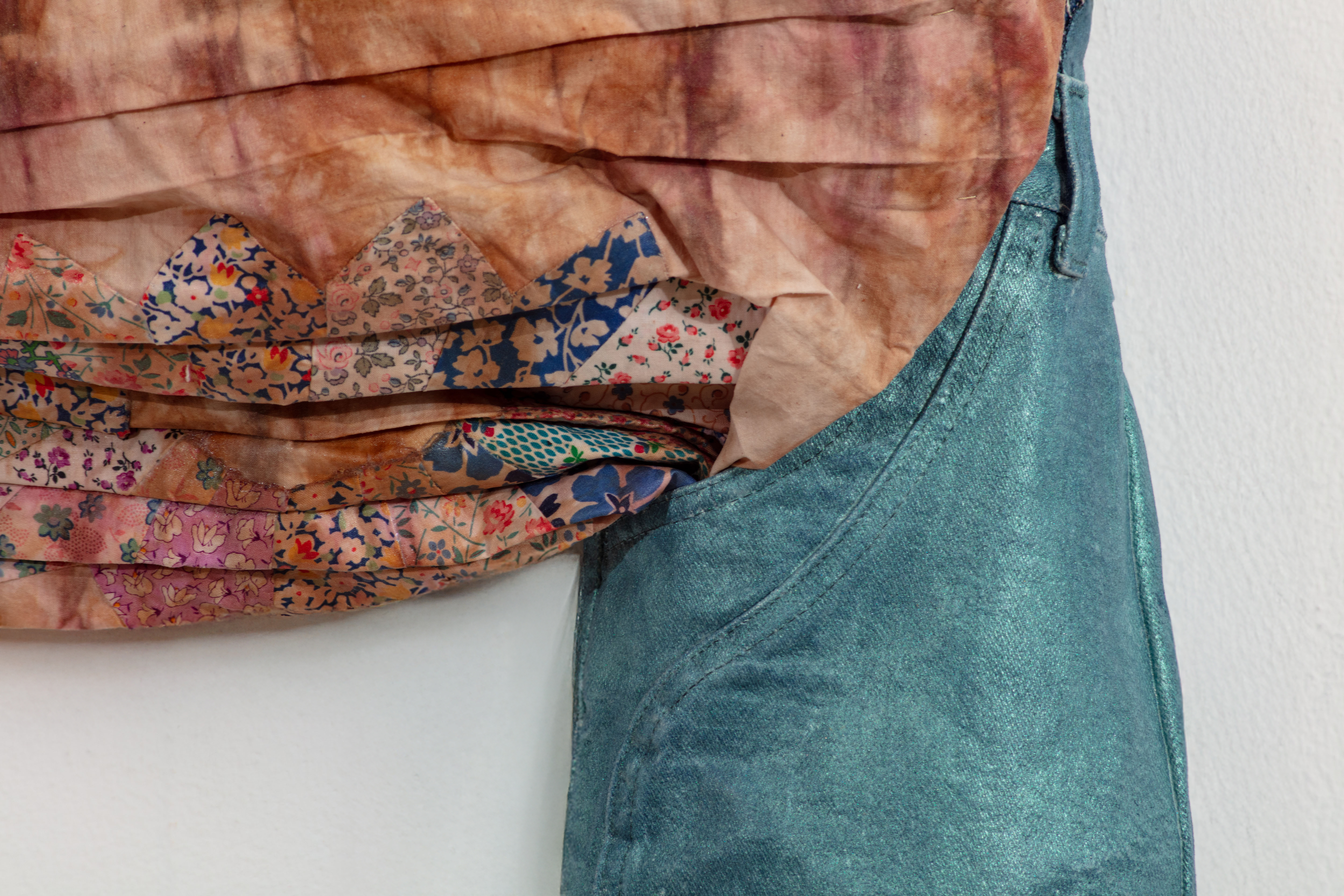 The remaining works in Cruising are playful, fragmented, and evocative in their materials and gestures. For Gloria, a found quilt top with the classic fan motif established the logic for folding and pleating that Gast used for the resist application of goldenrod and cochineal dye, and for the piece’s pleated form. It crawls up the wall from the pocket of cut-off vintage denim, polished to a sheen like Gloria Vanderbilt’s kaleidoscopic, patchwork-encrusted bedroom. An oversized key hangs from an indigo-dyed beaver stick peg. A fragmented denim derriere entreats viewers to “READ.”
