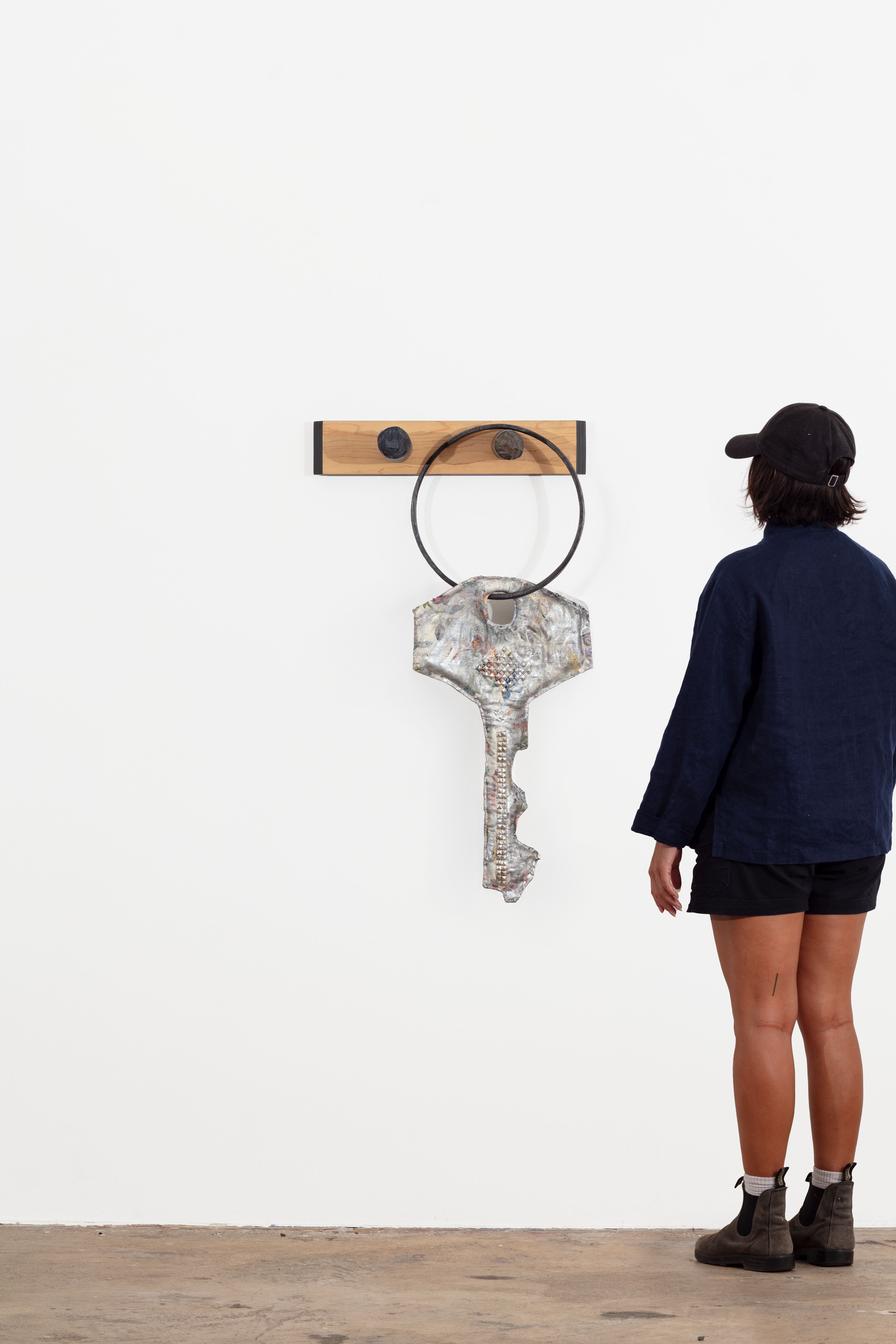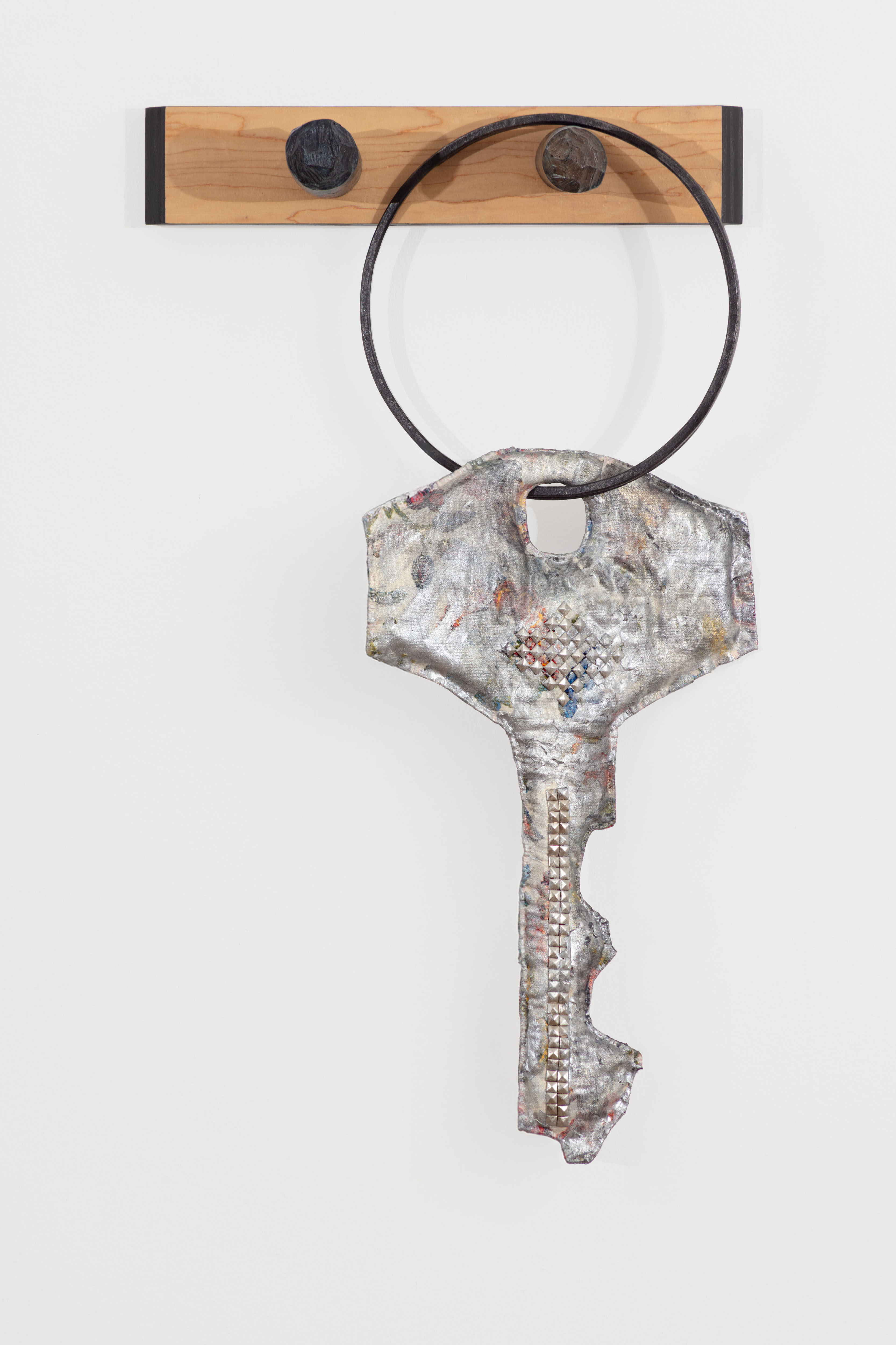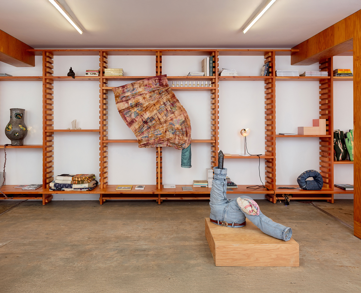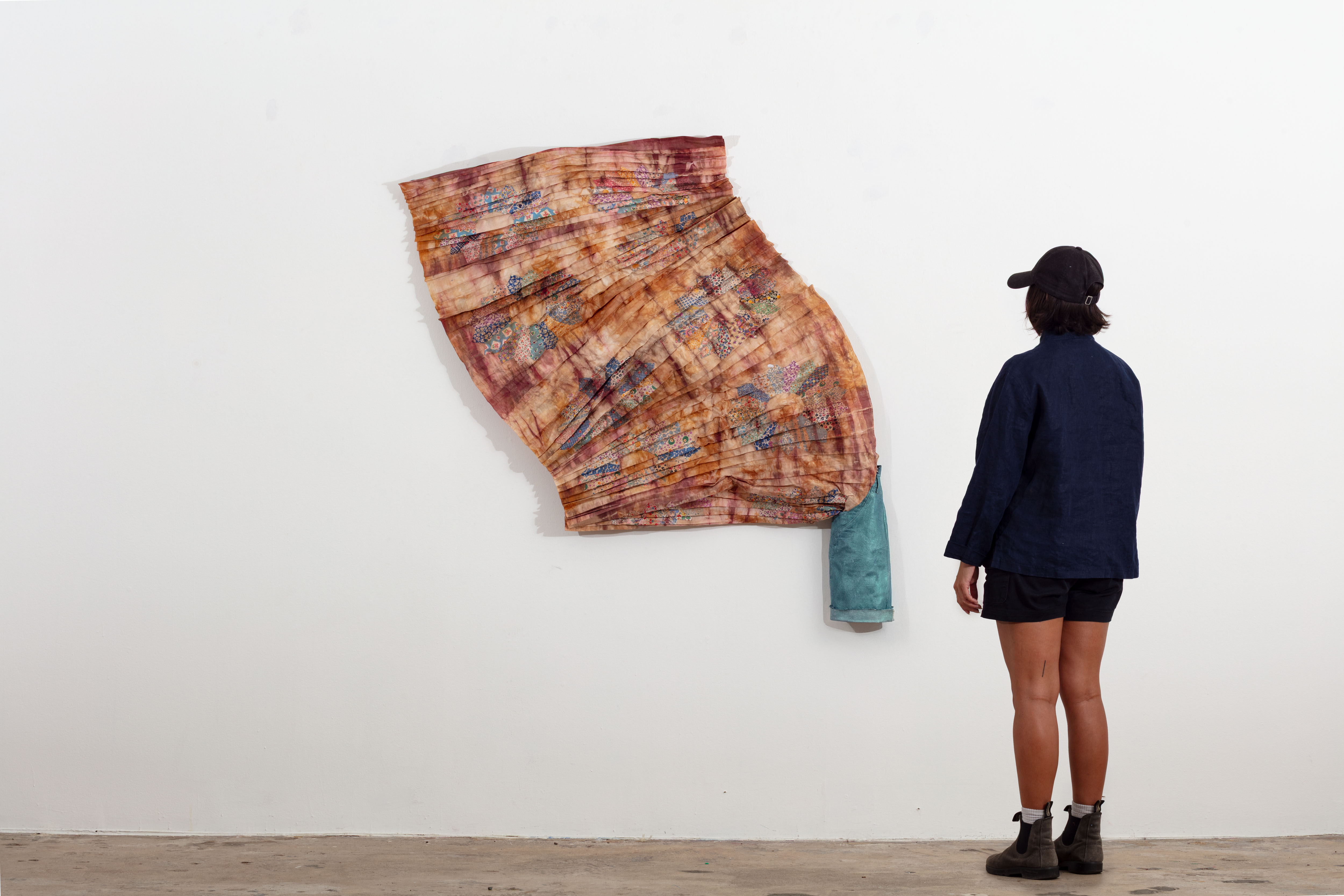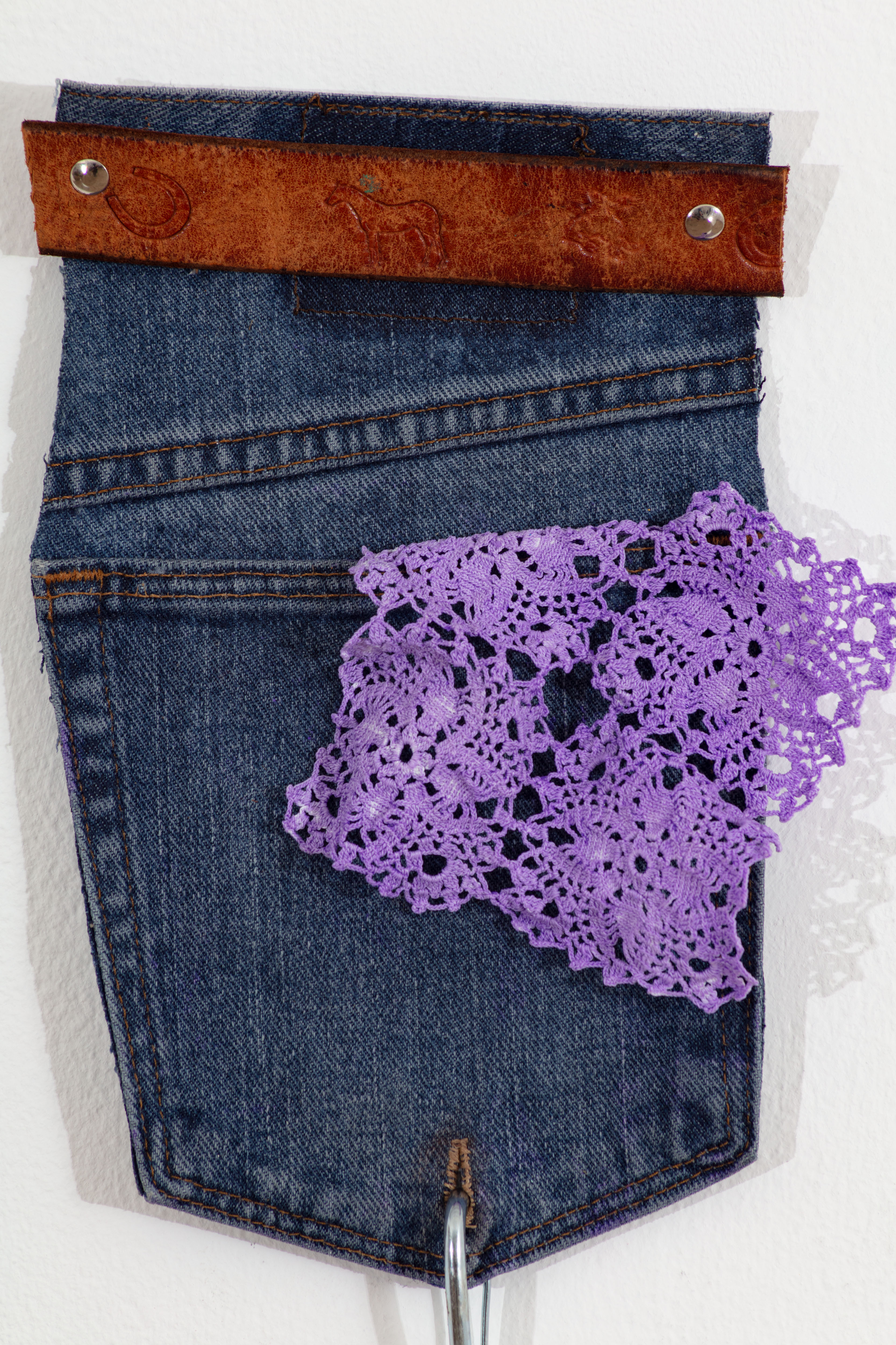 The remaining works in Cruising are playful, fragmented, and evocative in their materials and gestures. For Gloria, a found quilt top with the classic fan motif established the logic for folding and pleating that Gast used for the resist application of goldenrod and cochineal dye, and for the piece’s pleated form. It crawls up the wall from the pocket of cut-off vintage denim, polished to a sheen like Gloria Vanderbilt’s kaleidoscopic, patchwork-encrusted bedroom. An oversized key hangs from an indigo-dyed beaver stick peg. A fragmented denim derriere entreats viewers to “READ.”