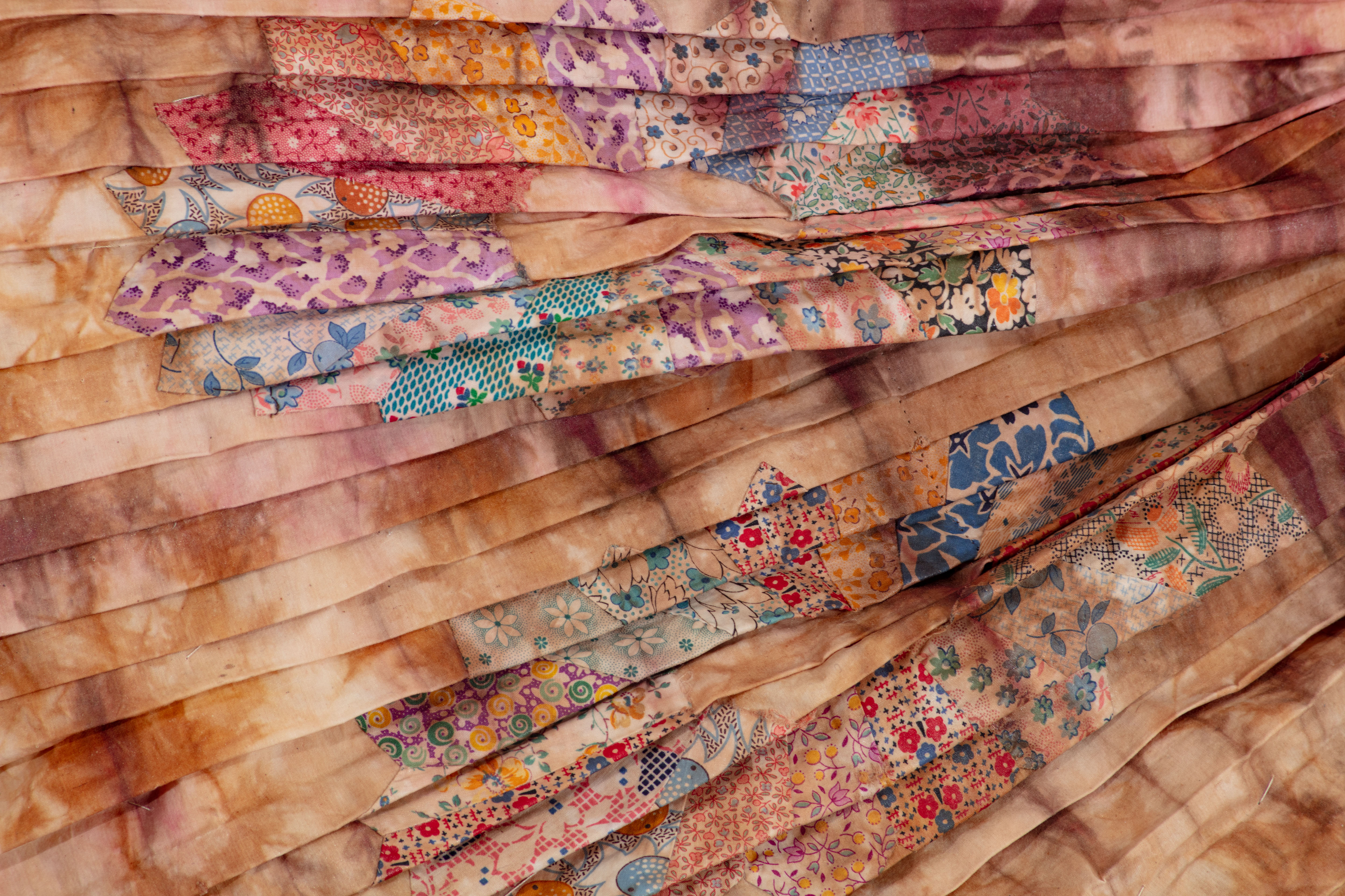Rachel Owens’ “stained glass” Origin Horizon filters light like planetary dawn through embedded casts of 3D-scanned fossils from the Devonian-era terrestrial ecosystem that produced the conditions for life to form on Earth. Paloma Barhaugh-Bordas’ quilt is anchored by two blue silk squares (scraps from a grandmother’s kimono) framed by hand-dyed acid red and cochineal swatches of linen, cotton and silk in an off-kilter log cabin motif. It emits a pink glow.