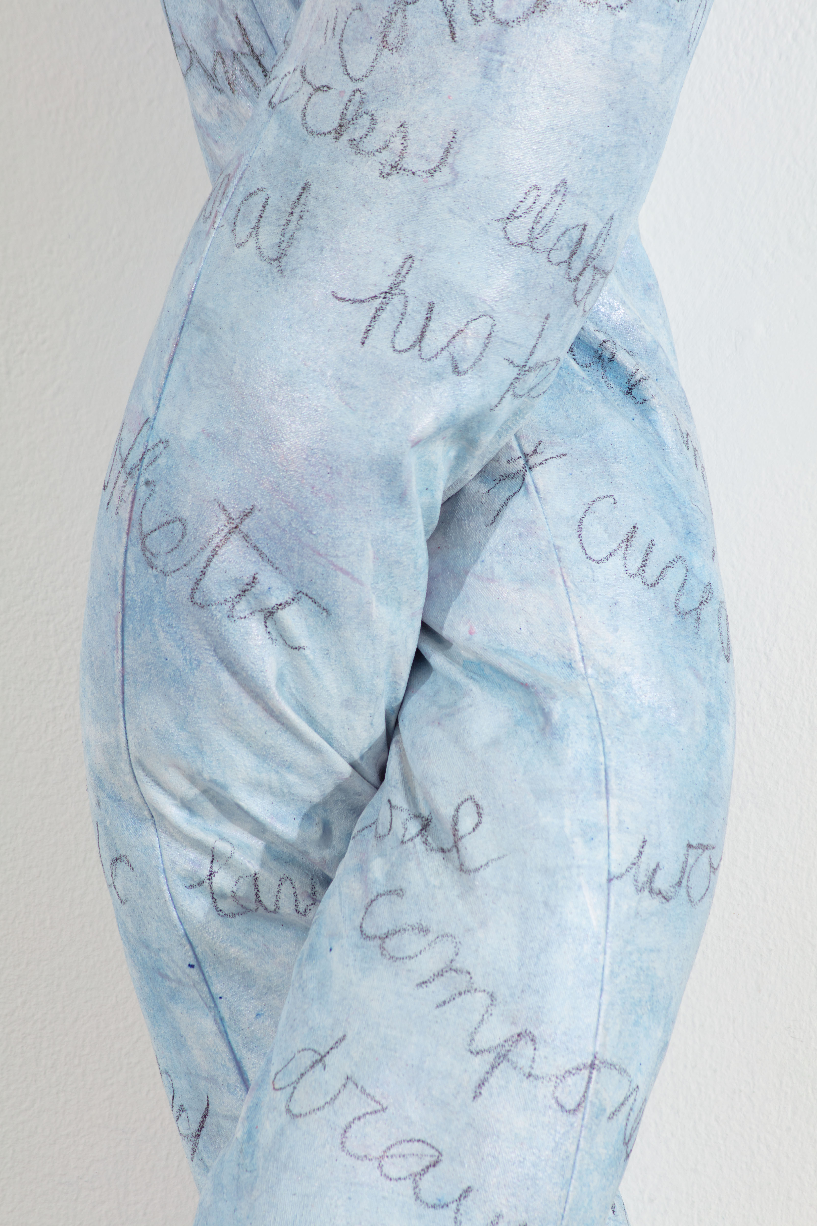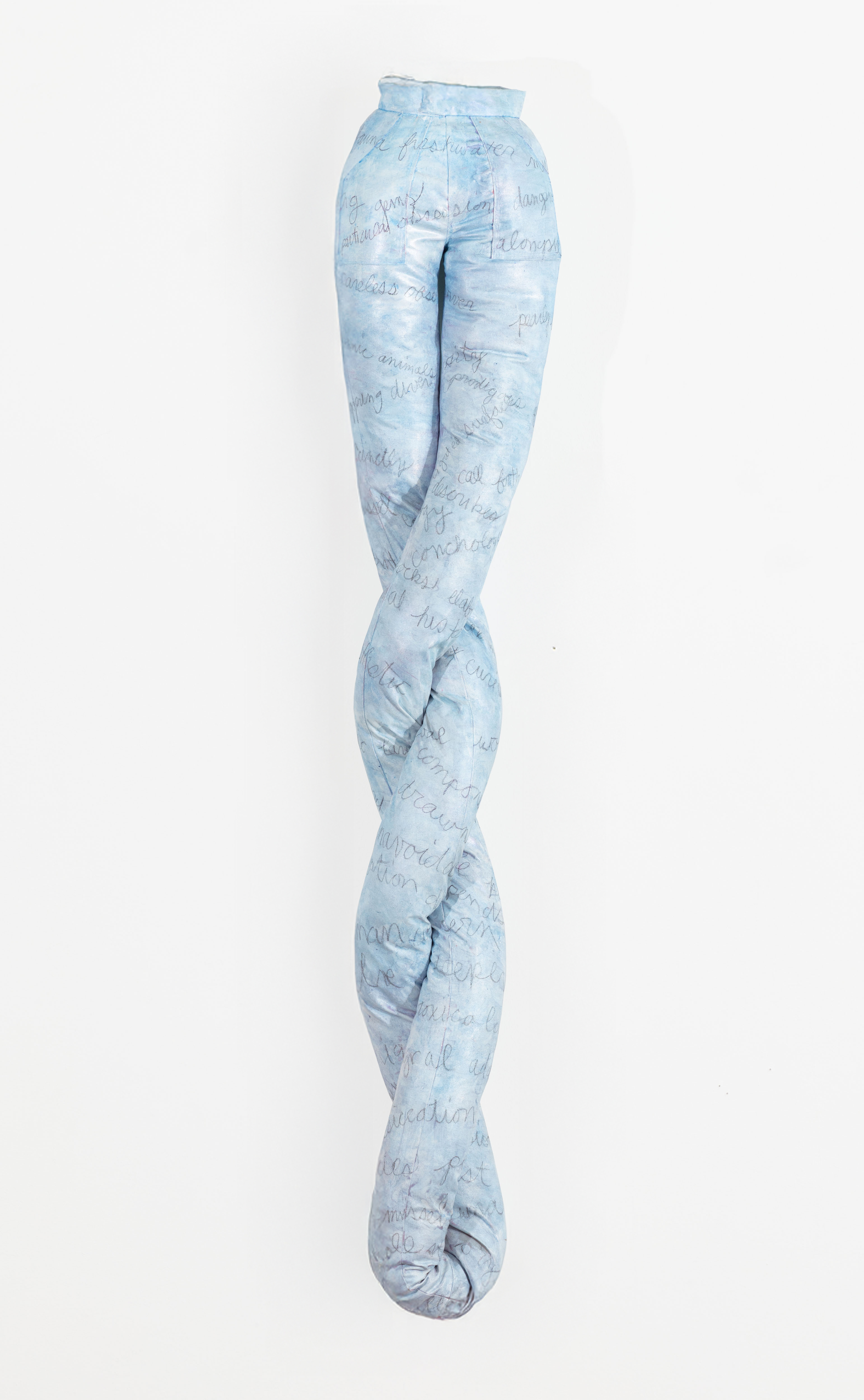 Mussel Notes is a Möbius-like loop of dungarees, with three twisting turns and a leg that folds back on itself, suspended from a quotidian metal bookshelf bracket. Scrawled in graphite on the garment’s pearlescent surface are notes describing the freshwater mussel’s uncanny reproductive cycle. Though blind and brainless, the animal forms its tongue into a fleshy lure and mimics the movement of a prey fish or insect, only to glitter-bomb its own spawn into the predator’s gills where they hitchhike upstream until they drop off to seed a new colony. The mussel’s strategy—seductive, indirect, and astonishingly effective—mirrors the work’s own looping logic and sensual camouflage.