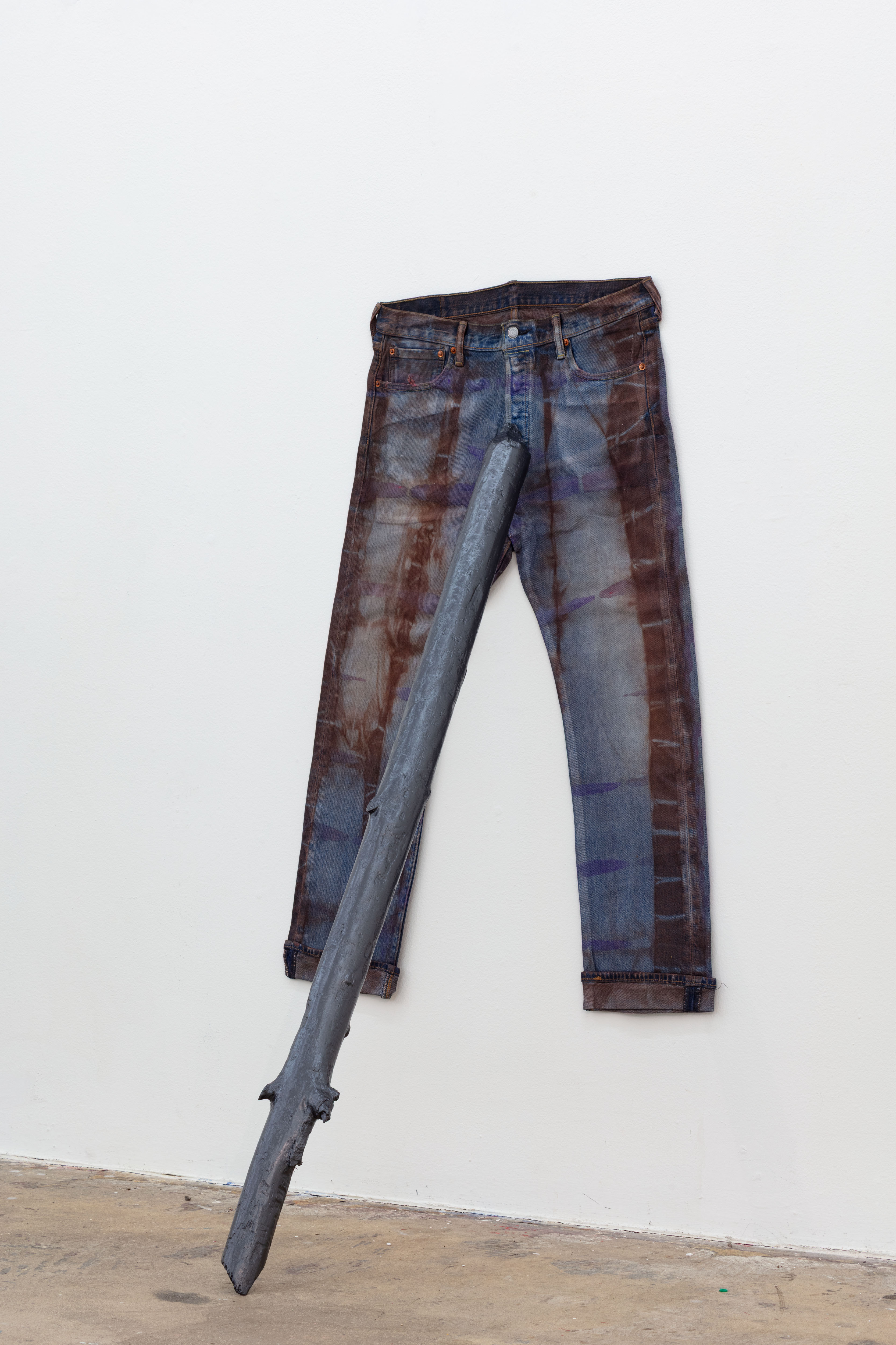 Gast approached Cruising with the spirit of “flirting in the library,” pulling fleeting references and material poetry into each piece. Resist, Rust, Press appears to be a quick assemblage: crisp-flat Levi’s pinned to the wall with a piece of wood, á la Charles Ray’s two-part photographic work, Plank Piece (1973), which documents the artist suspended (or impaled) against the wall by a wooden plank. In Gast’s piece, the surface pattern on the denim was achieved with two resist-dye techniques and the application of rust to “sadden” the goldenrod yellow, and all dimensionality was removed by repeatedly passing the jeans through a printing press. The wood is one of many beaver-carved sticks that Gast has collected near her home in Dutchess County, New York, and still bears the animals’ teeth marks.