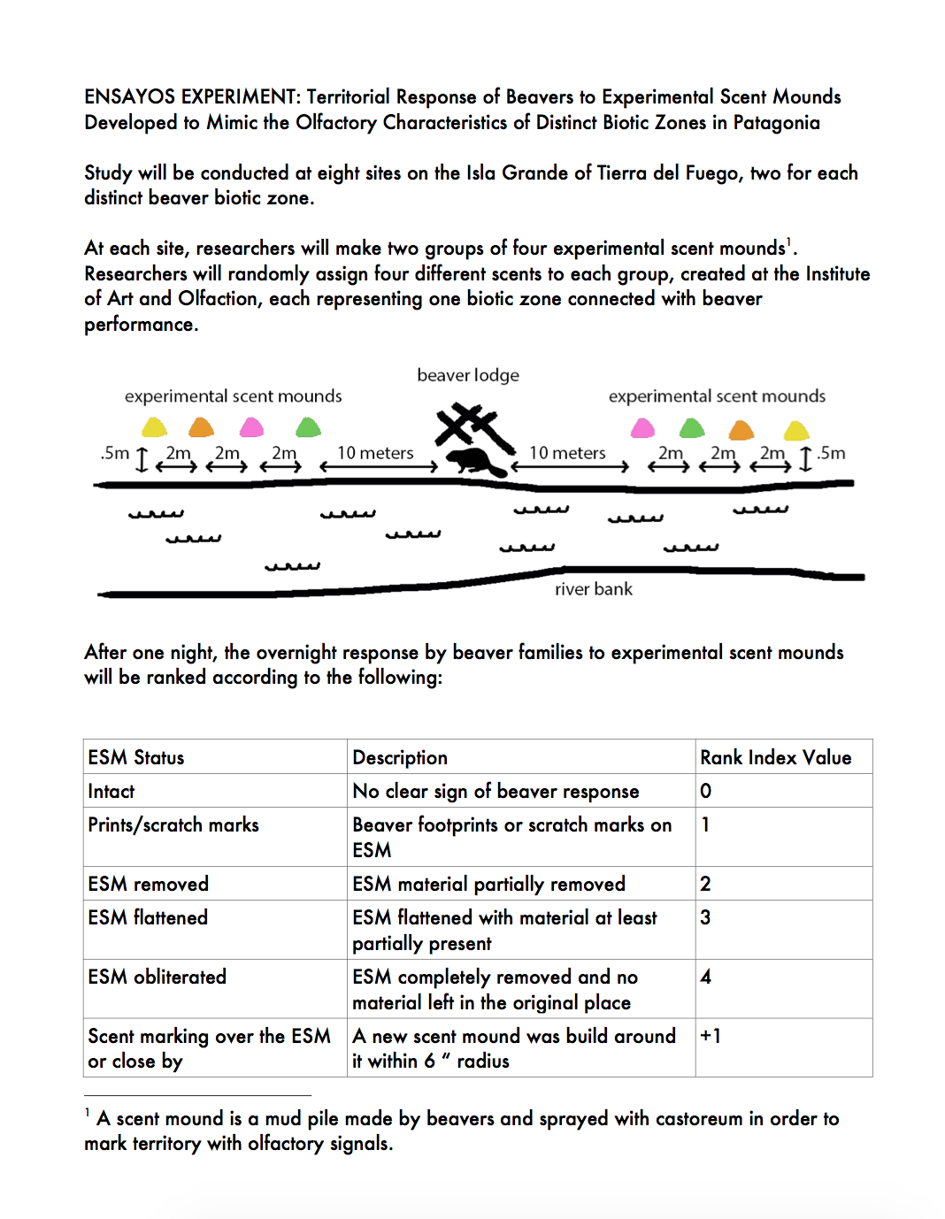 Dear Enemy consists of four perfumes created by a team of artists and scientists in an attempt to initiate interspecies communication between humans and beavers in Tierra del Fuego, and the application of these scents in both human-dominated and beaver-dominated locations through exhibitions and fieldwork. The Dear Enemy Effect is a behavioral phenomenon observed in animals who are less aggressive to neighbors with whom they have clearly established boundaries. Beavers establish boundaries through building scent mounds –piles of mud, leaves and pond-bottom debris- around the perimeter of their territory. They then smear castoreum, a substance that comes from their castor sacs, over the mound. Chemicals compounds in the castoreum –gleaned from the shrubs, leaves and twigs that the beavers eat- convey to young roaming beavers that a particular pond is occupied.