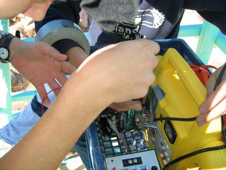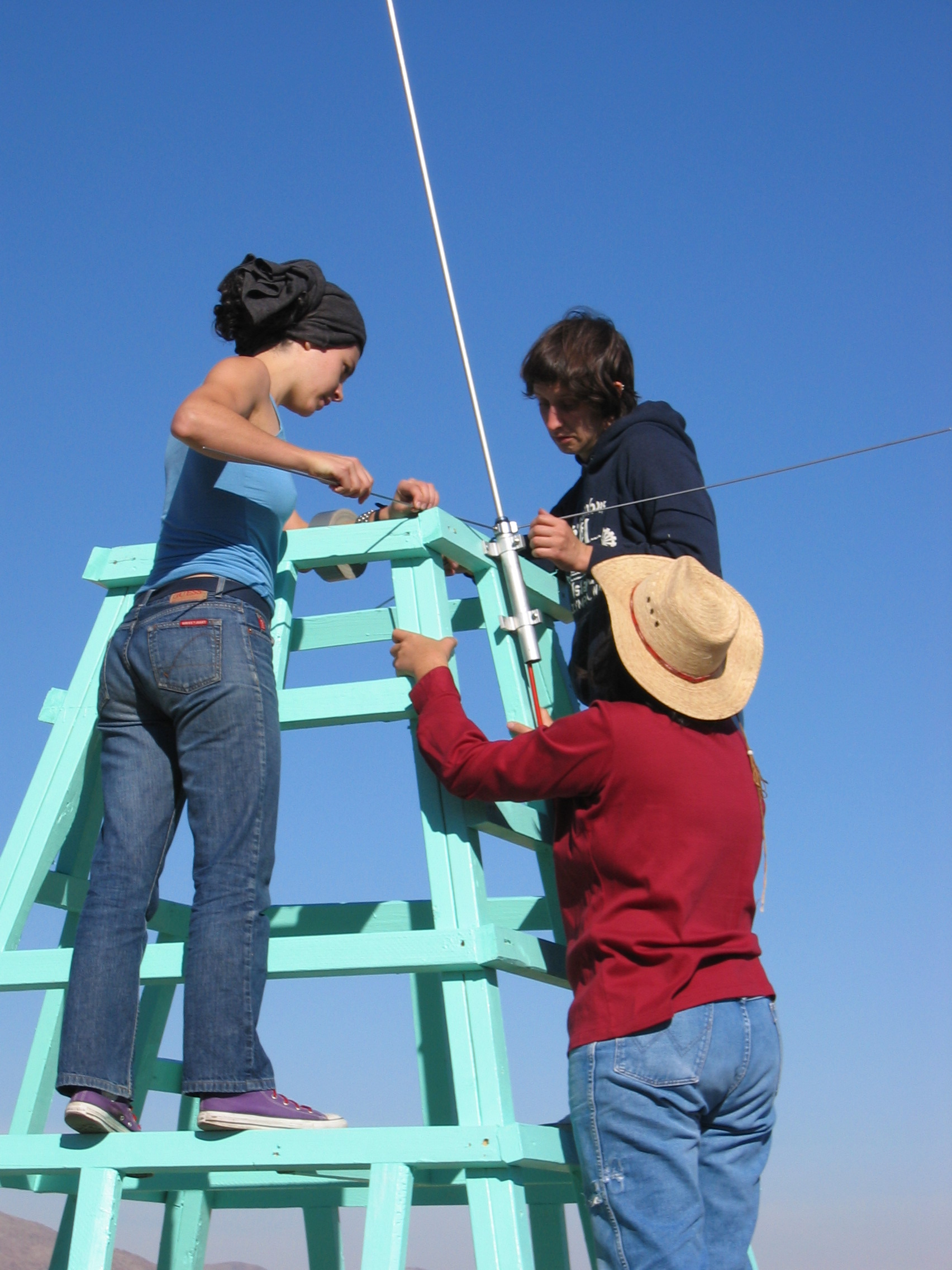 The transmitter was assembled on-site, using commercially available components, and broadcast from a tower built by Justin Beal. Its signal reached about seven miles into the valley below. Free Radio HDTS was again installed, tower and all, at LACE in Los Angeles, broadcasting in downtown LA for three months. Excerpts were also featured in “Daily Noise, 22 Days of Sound Art” at Columbia University’s Leroy Neiman Gallery; and on WFMU in New York City as part of Performa 05.