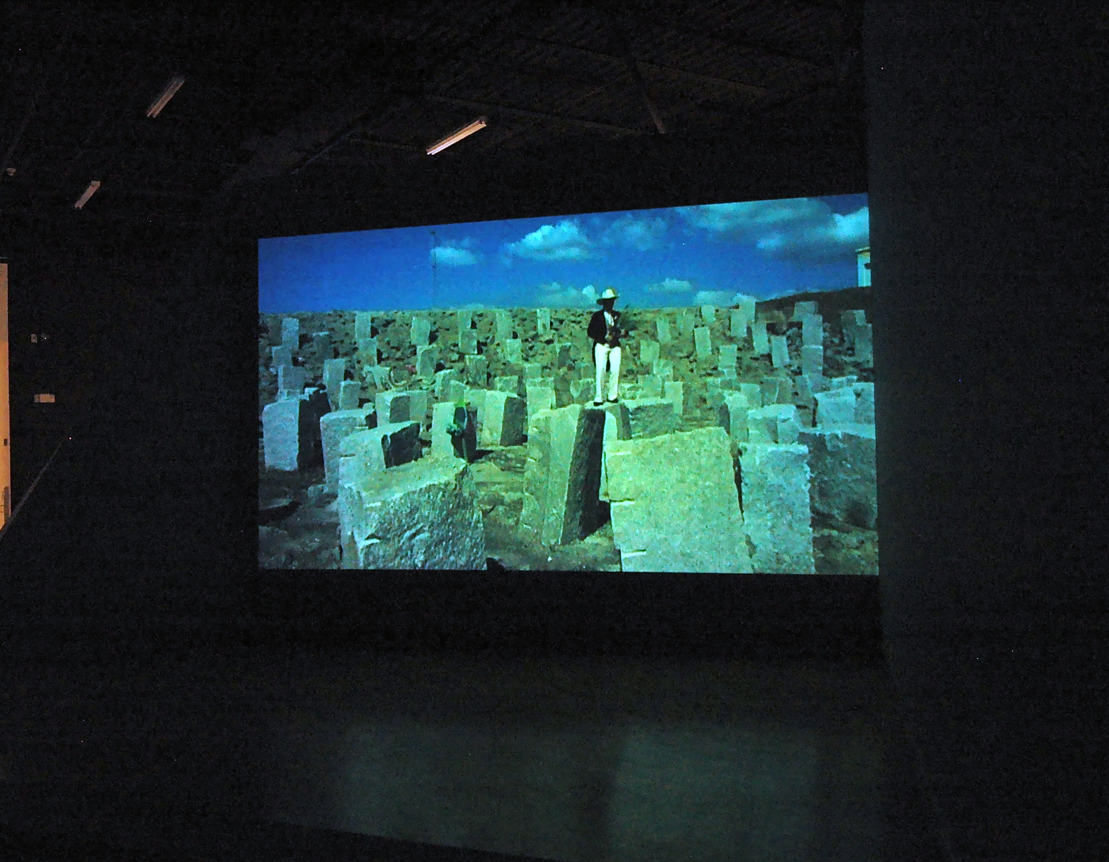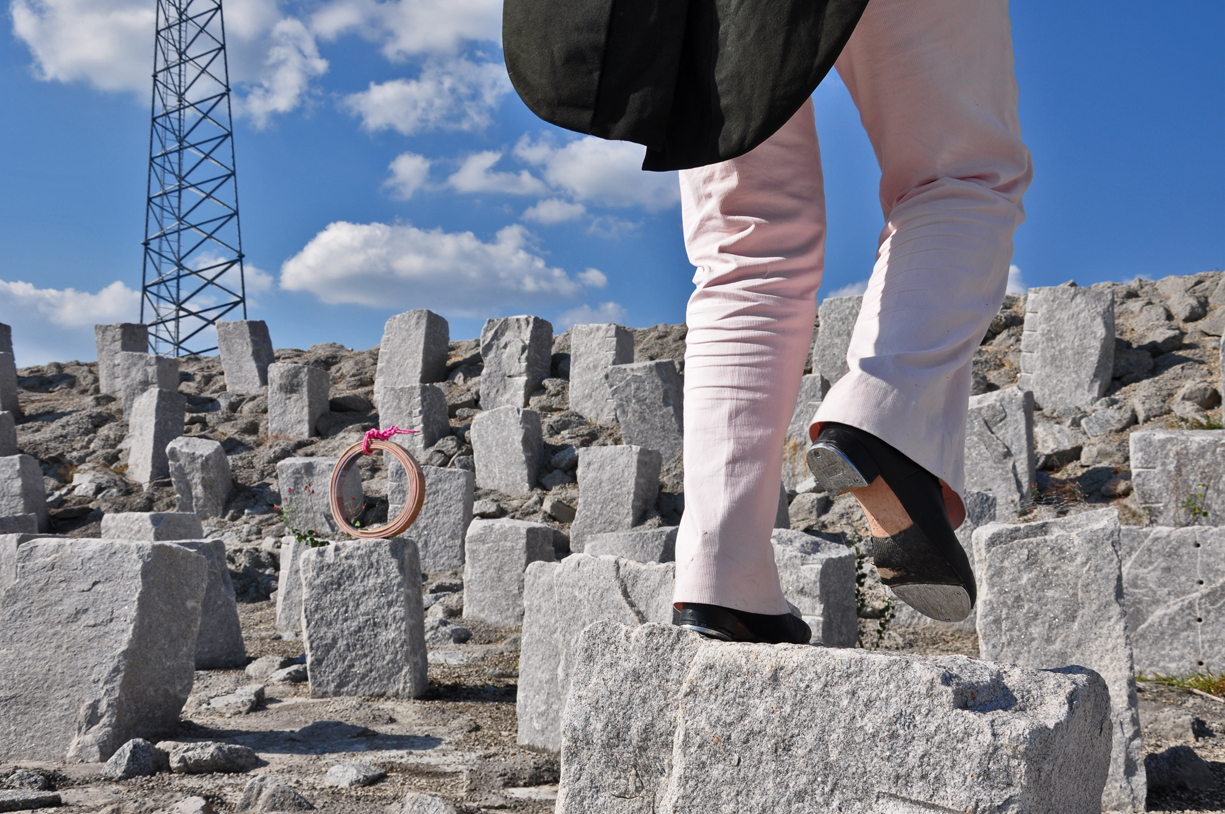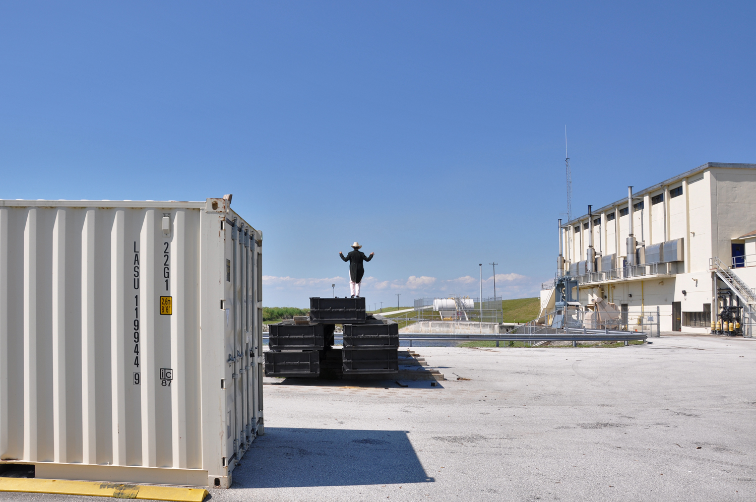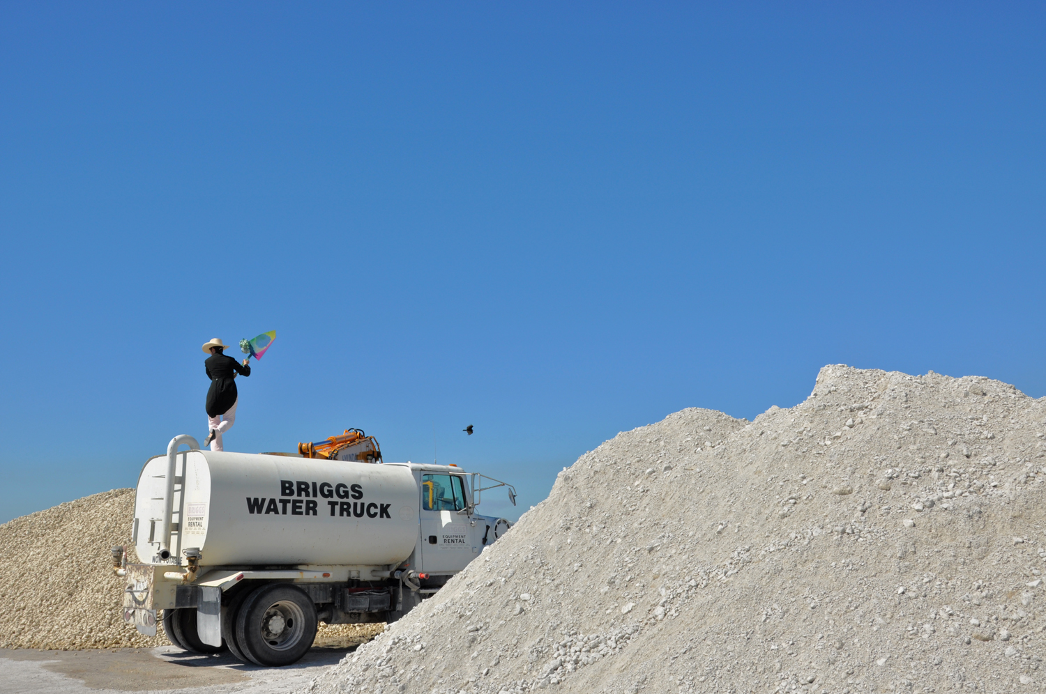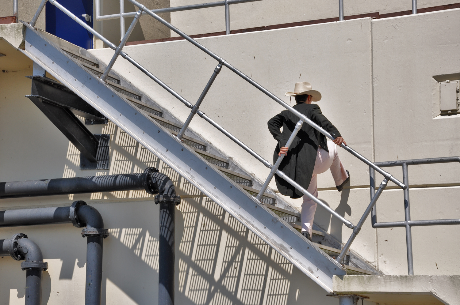 Taking advantage of the engineering conventions adorning this 140 mile-long social sculpture, she taps out an assortment of rhythms on a ribbon of crunching gravel and asphalt, plinking steel grates and barrier gates, reverberating water tanks and a confounding array of limestone columns jutting from the slope. This feat of environmental engineering—derided by environmentalists but essential to several communities—is transformed into a colossal stage, its parts reconceptualized as ready-made musical instruments. It appears that crows, egrets and vultures are the only witnesses as the lone tuxedoed figure stomps, leaps and shuffles resolutely through the not-quite-natural landscape.