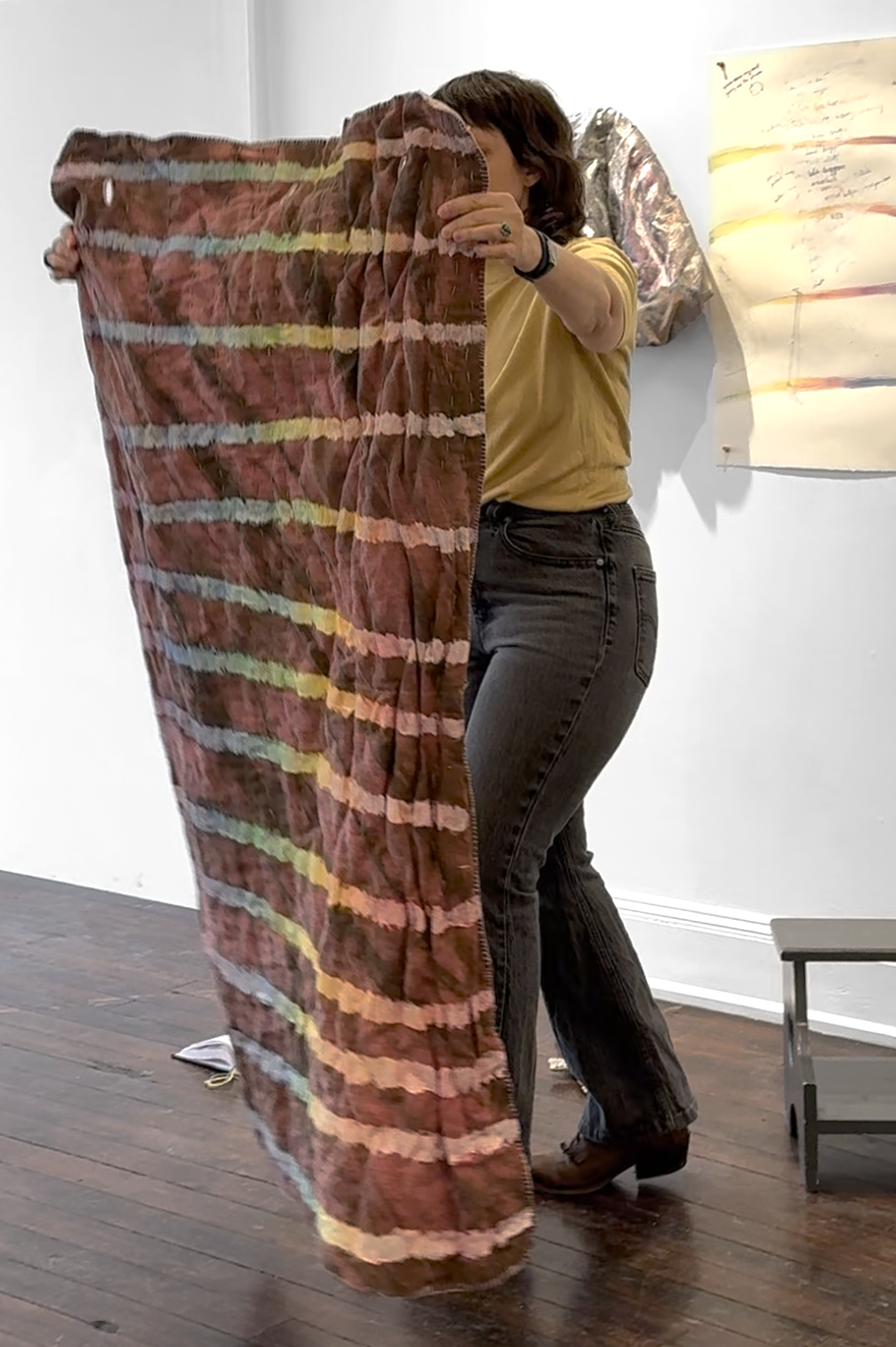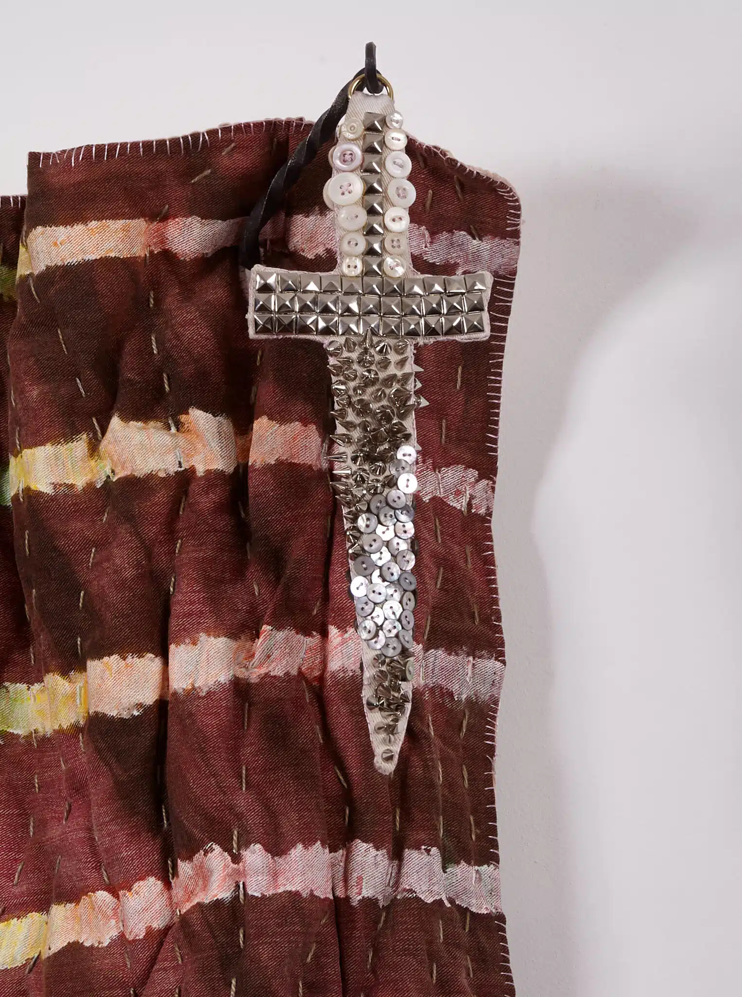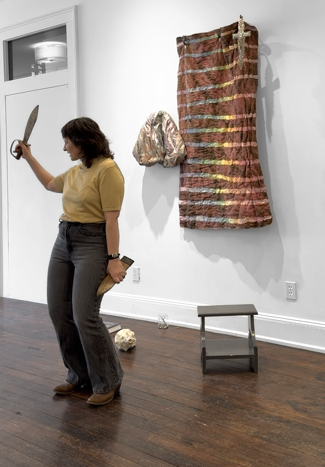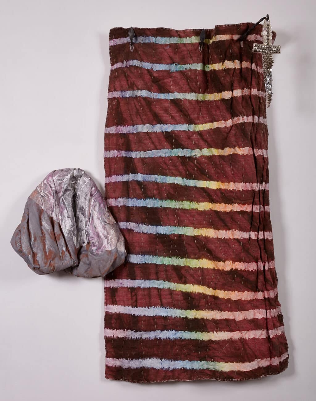 Mussel Bed / Silver Dagger (2025) Cotton, silk, wool, fiberfill, shell, zinc, pigment, wrought iron 57 x 44 x 9 in.