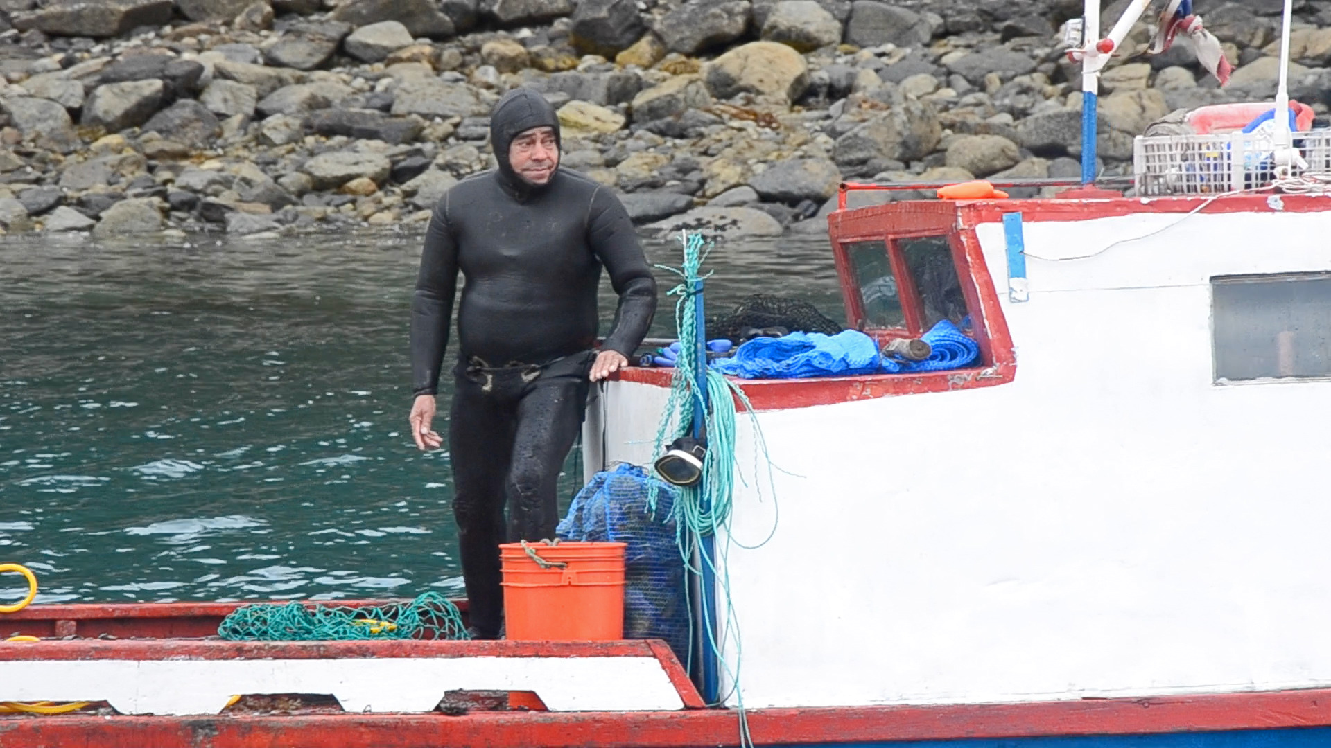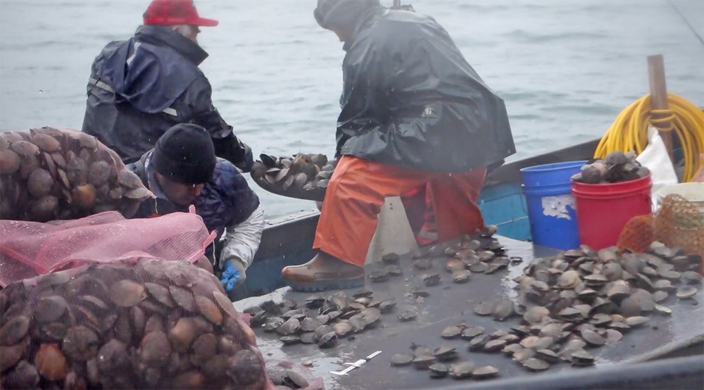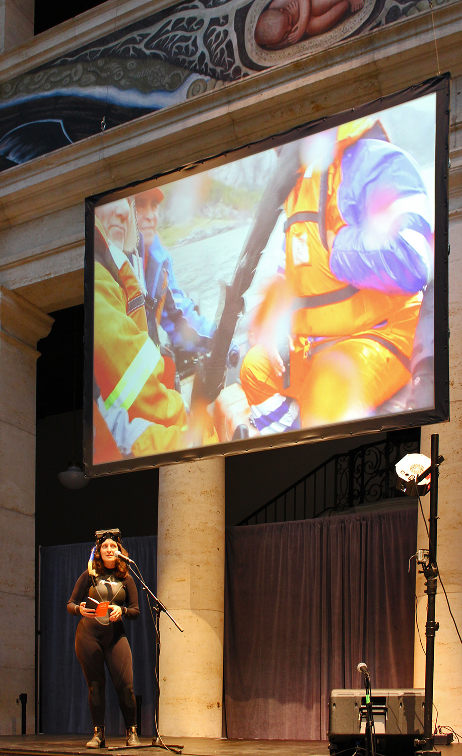 We find ourselves inside an artisanal fishing boat during a storm, its creaking and rocking provides the rhythm for a song; the audience joins in. We are under water with a whale. The whale whispers, we learn its song. We are underwater collecting shellfish; we sing the forgotten song of the west wind. The lecture begins as a conventional artist’s talk, but as the camera dives below water the tone changes—the audience and the artist are immersed in the world of the fjord and must come to terms with its inhabitants, past and present.